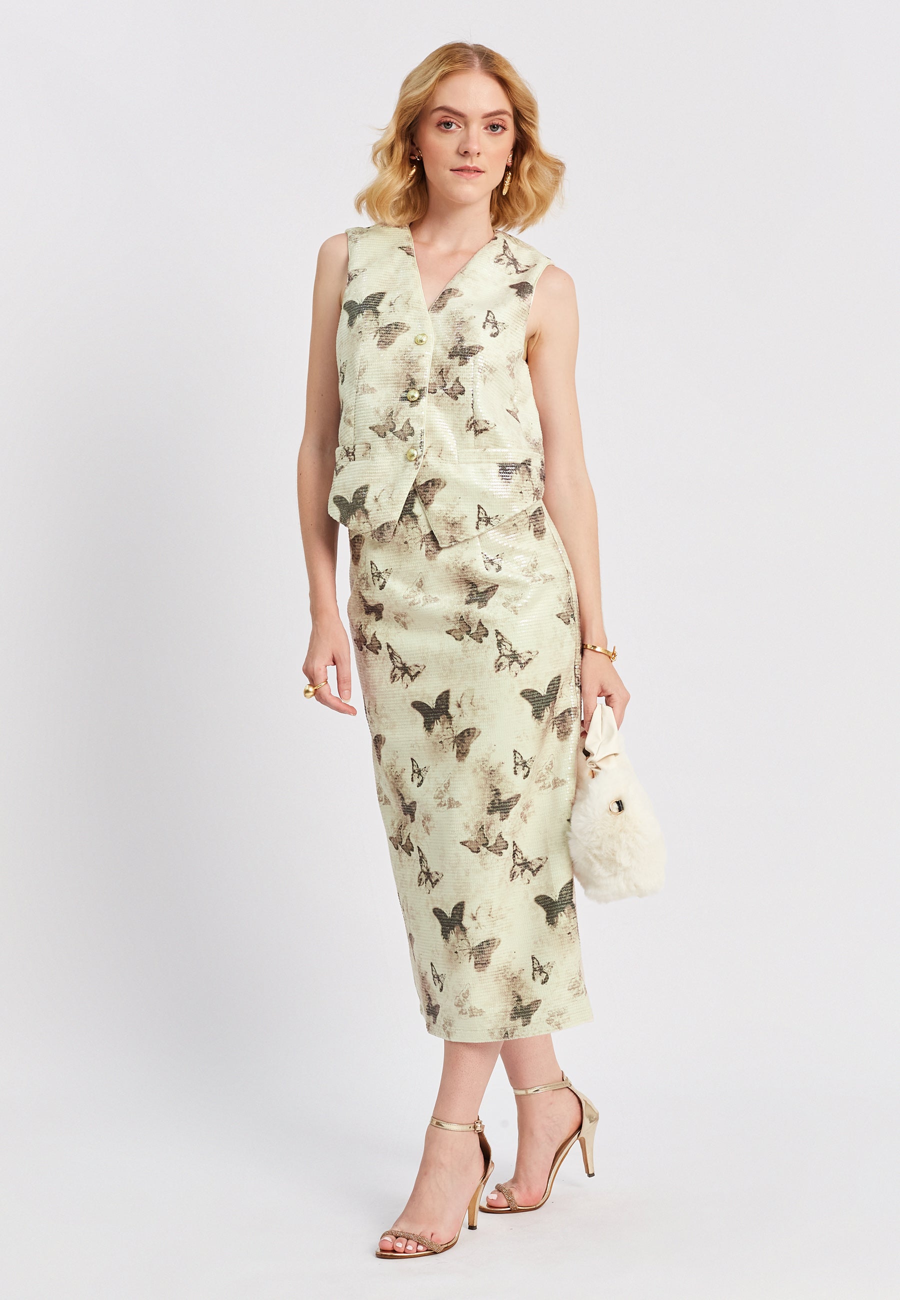 Crafted from stunning sequins fabric, the Alyona Waistcoat adds a touch of sparkle to any outfit. With a delicate butterfly print, this waistcoat is perfect for elevating your office wardrobe. Stand out and shine in style with this must-have piece.