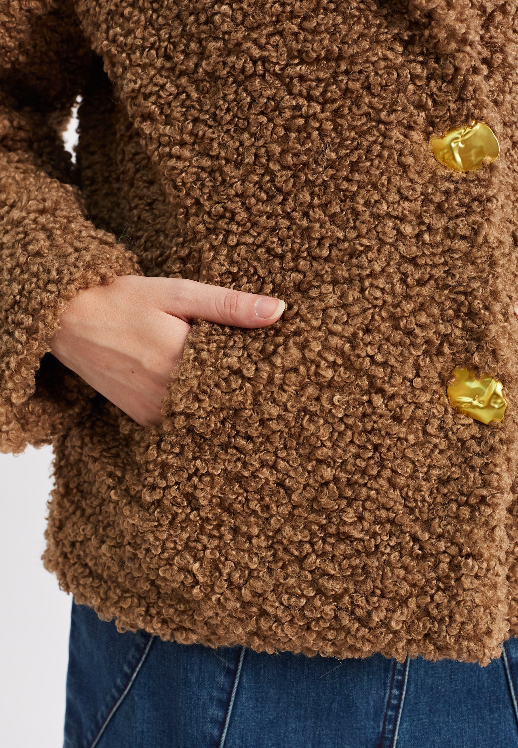 El abrigo Carolina está confeccionado con maestría en tela de osito de peluche, ofreciendo calidez y estilo. Con gruesos botones dorados, este abrigo irradia un aspecto profesional y sofisticado. Su longitud corta lo hace versátil para cualquier ocasión. Siéntete cómoda y elegante con el abrigo Carolina.