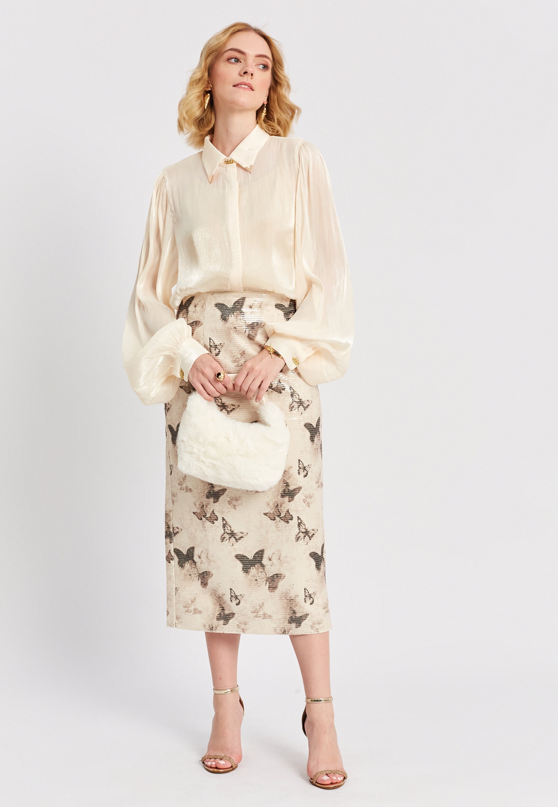 Presentamos la falda Alyona, una falda midi de primera calidad con un impresionante estampado de mariposas y delicadas lentejuelas. Confeccionada con maestría, esta falda es el complemento perfecto para cualquier armario. Disfruta de un toque de elegancia y sofisticación con cada prenda.