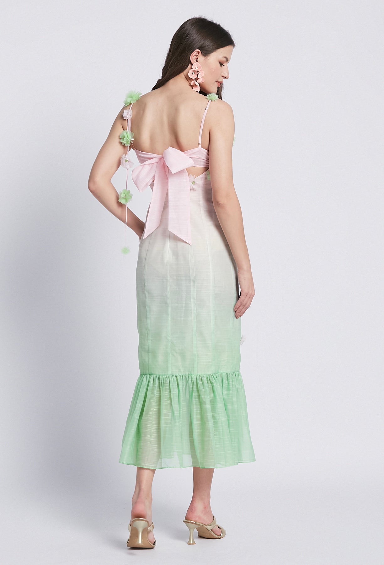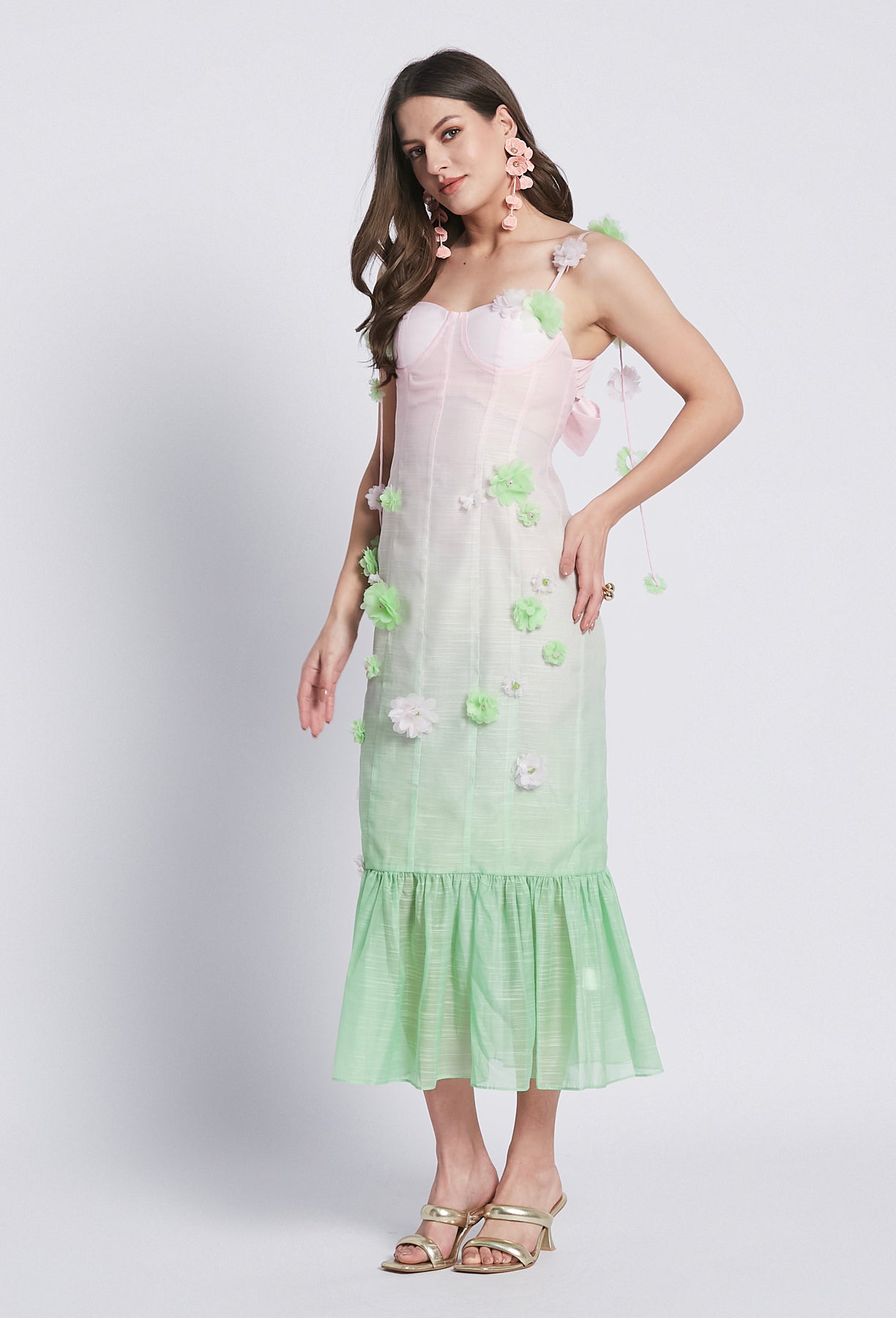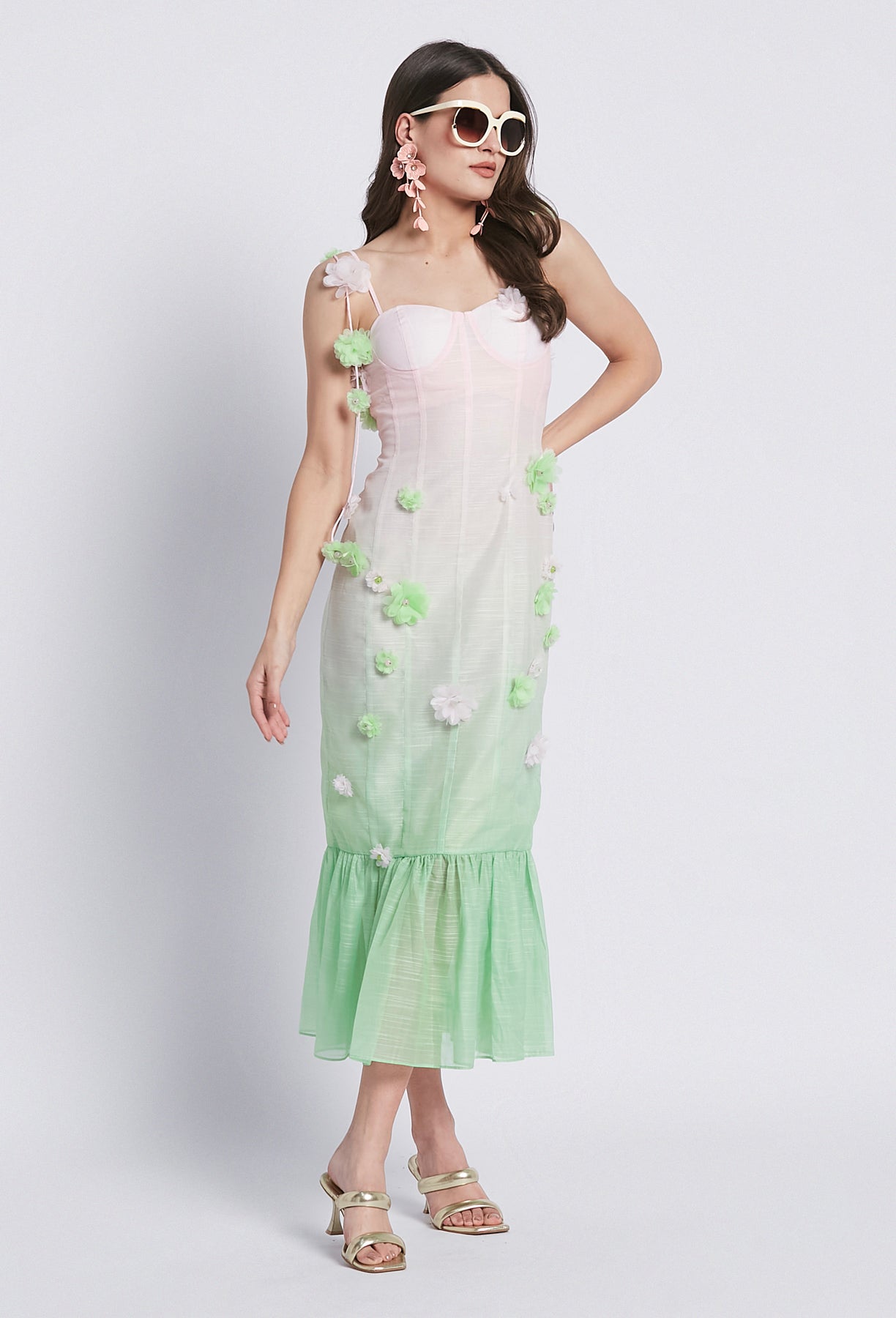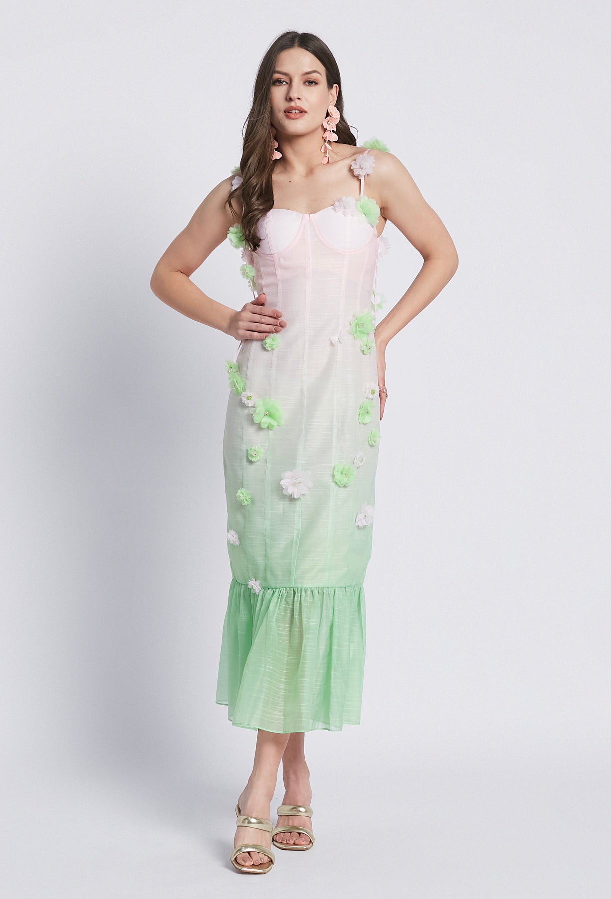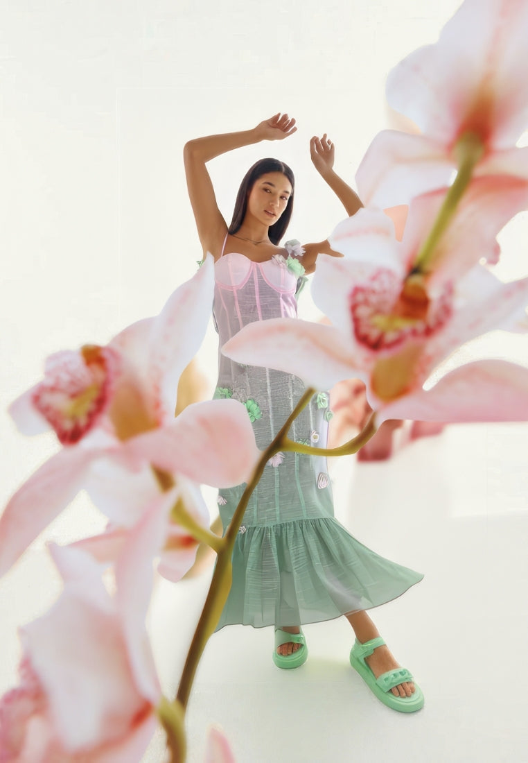 Sapientemente realizzato con un lussuoso misto lino, l'abito Alysa in edizione limitata vanta fiori ricamati in una deliziosa combinazione di colori verde e rosa. Perfetto per l'estate, questo abito lungo fino alla caviglia trasuda eleganza e raffinatezza.