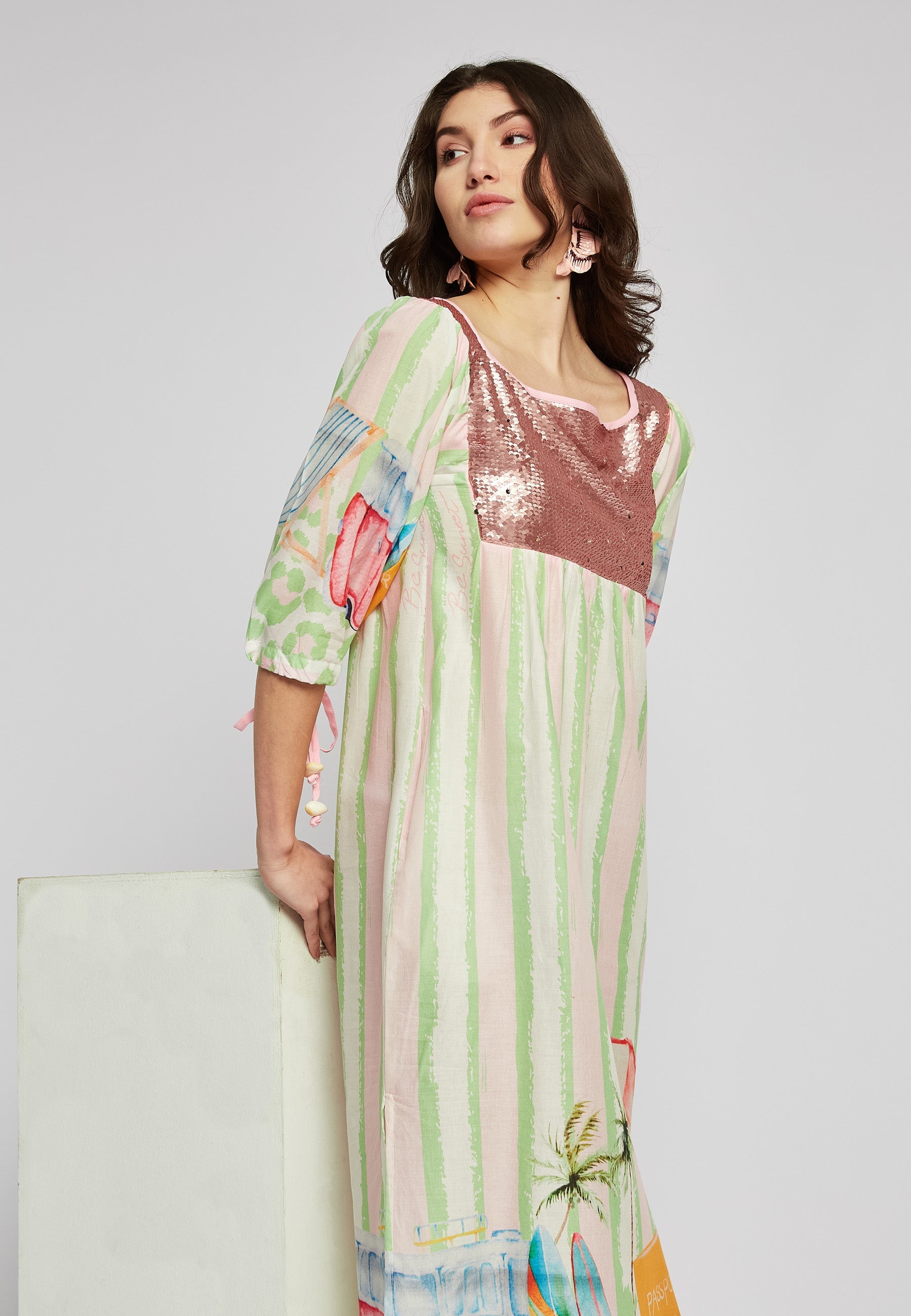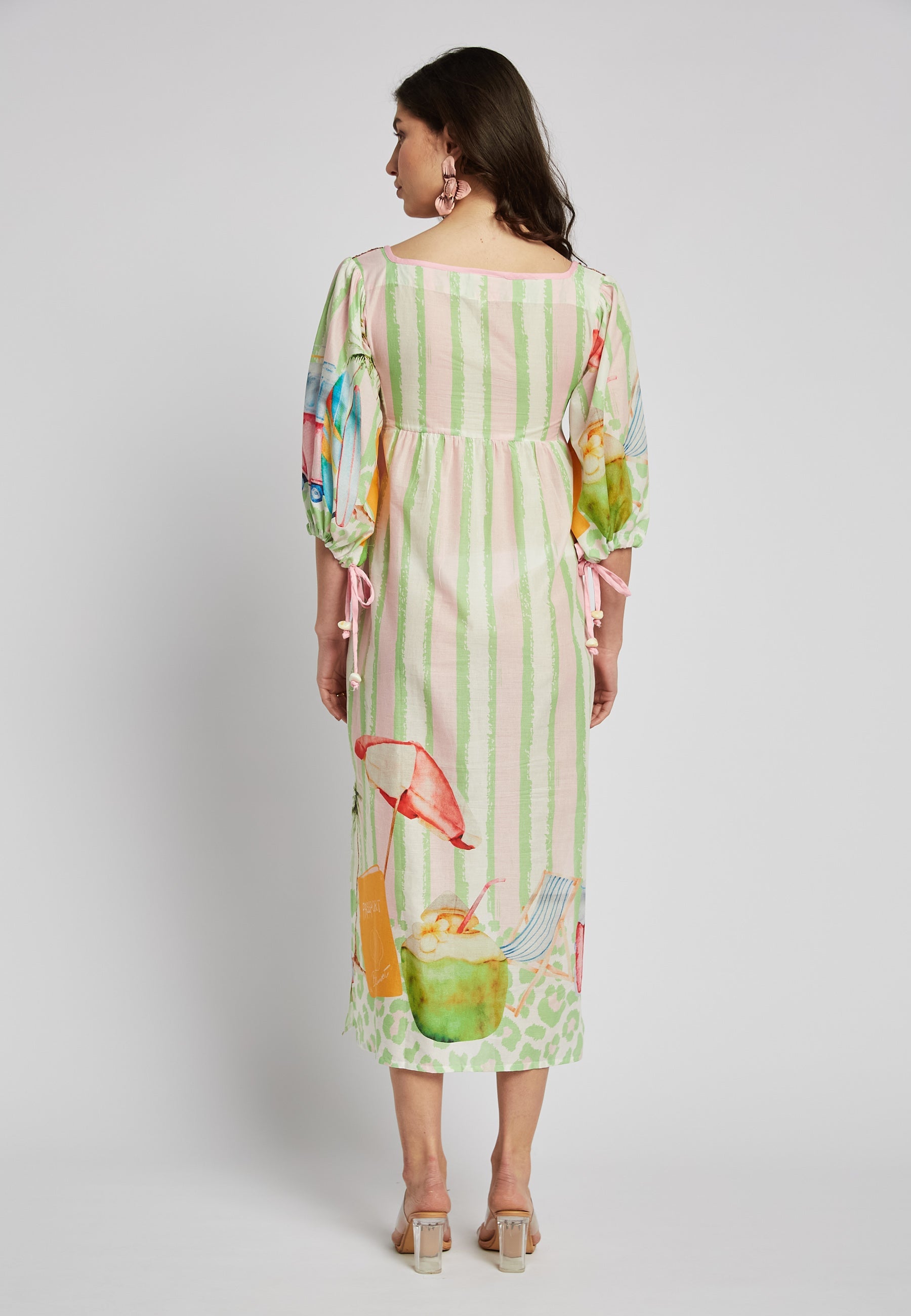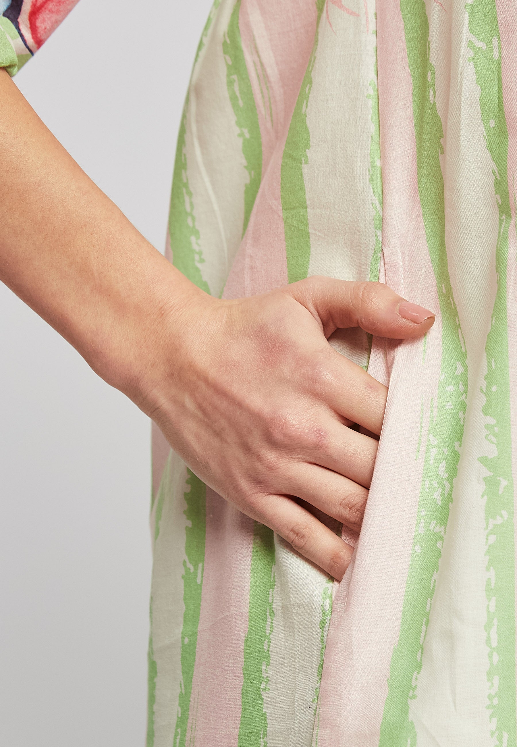 Il Mar Trip Dress è la combinazione perfetta di comfort e stile. Realizzato con un materiale morbido e pensato per la fashionista casual, questo vestito presenta una stampa trendy a righe rosa e verdi, perfetta per l'estate. Rinnova il tuo guardaroba con questo vestito imperdibile.