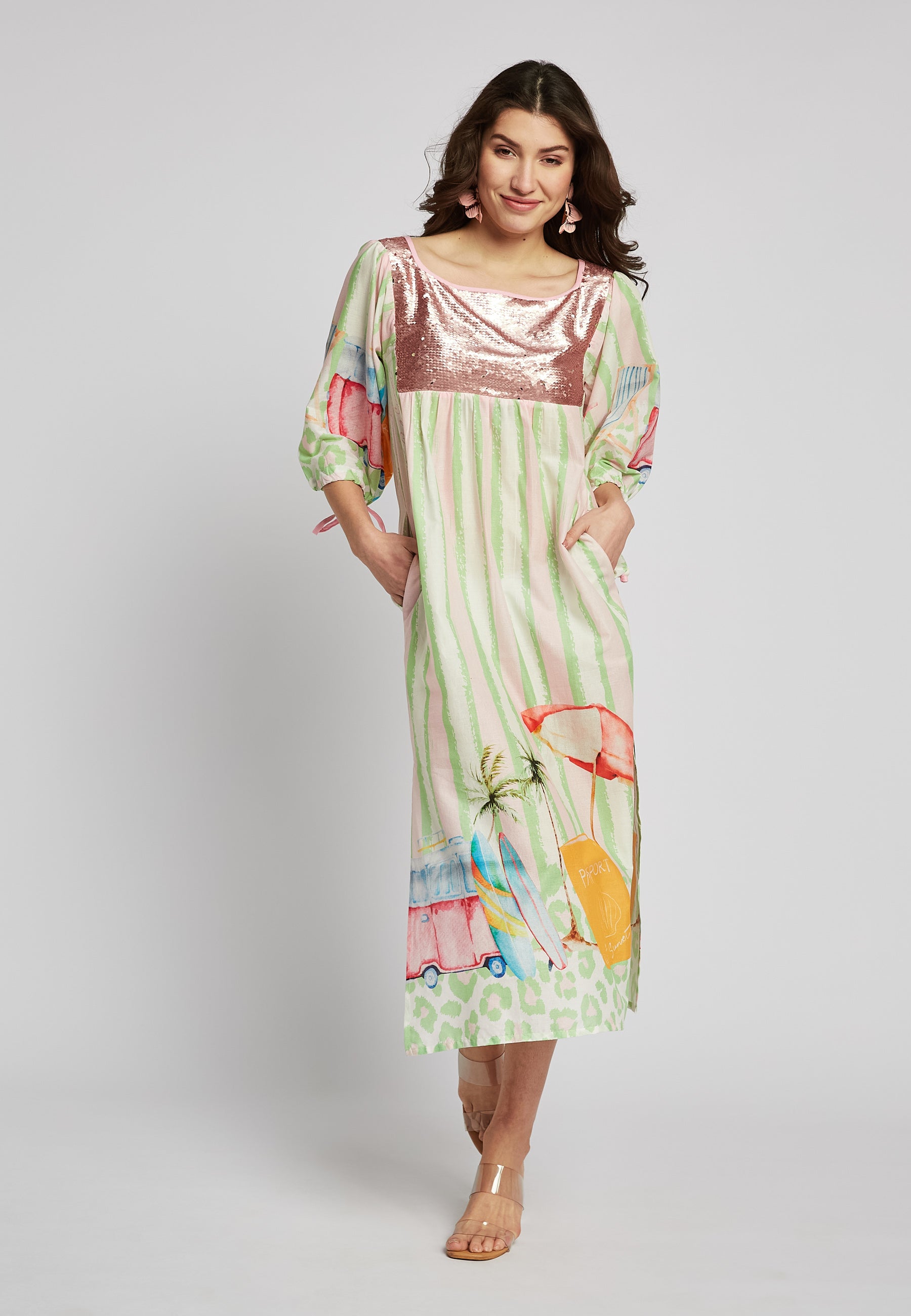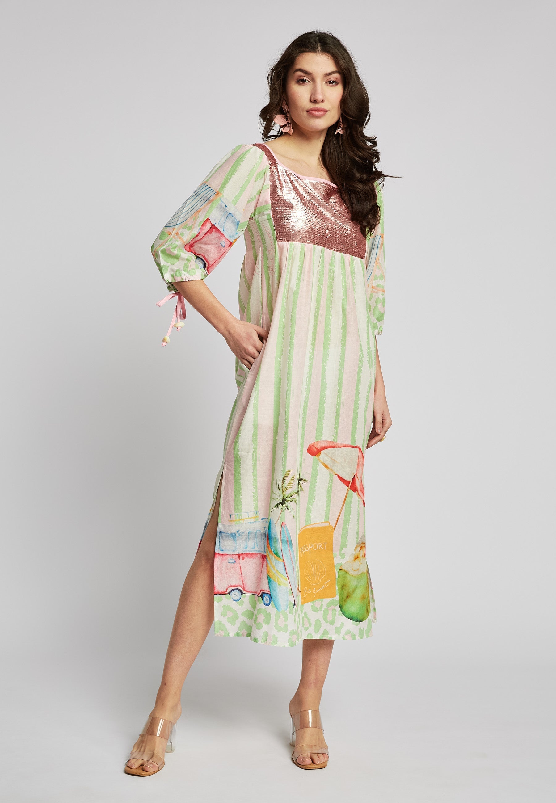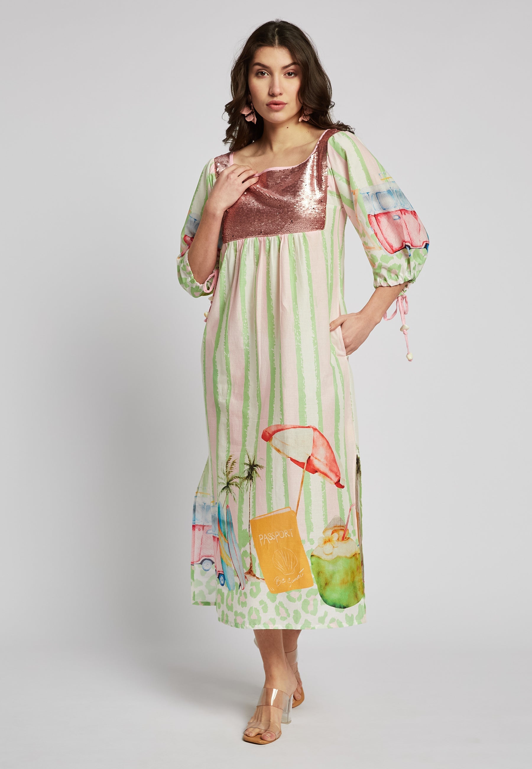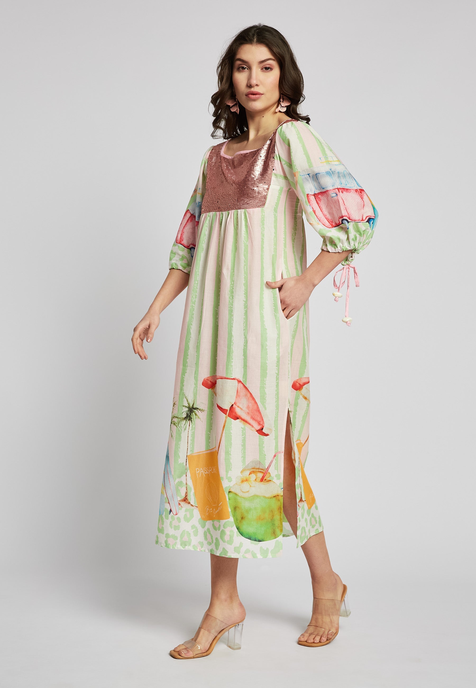 Il Mar Trip Dress è la combinazione perfetta di comfort e stile. Realizzato con un materiale morbido e pensato per la fashionista casual, questo vestito presenta una stampa trendy a righe rosa e verdi, perfetta per l'estate. Rinnova il tuo guardaroba con questo vestito imperdibile.