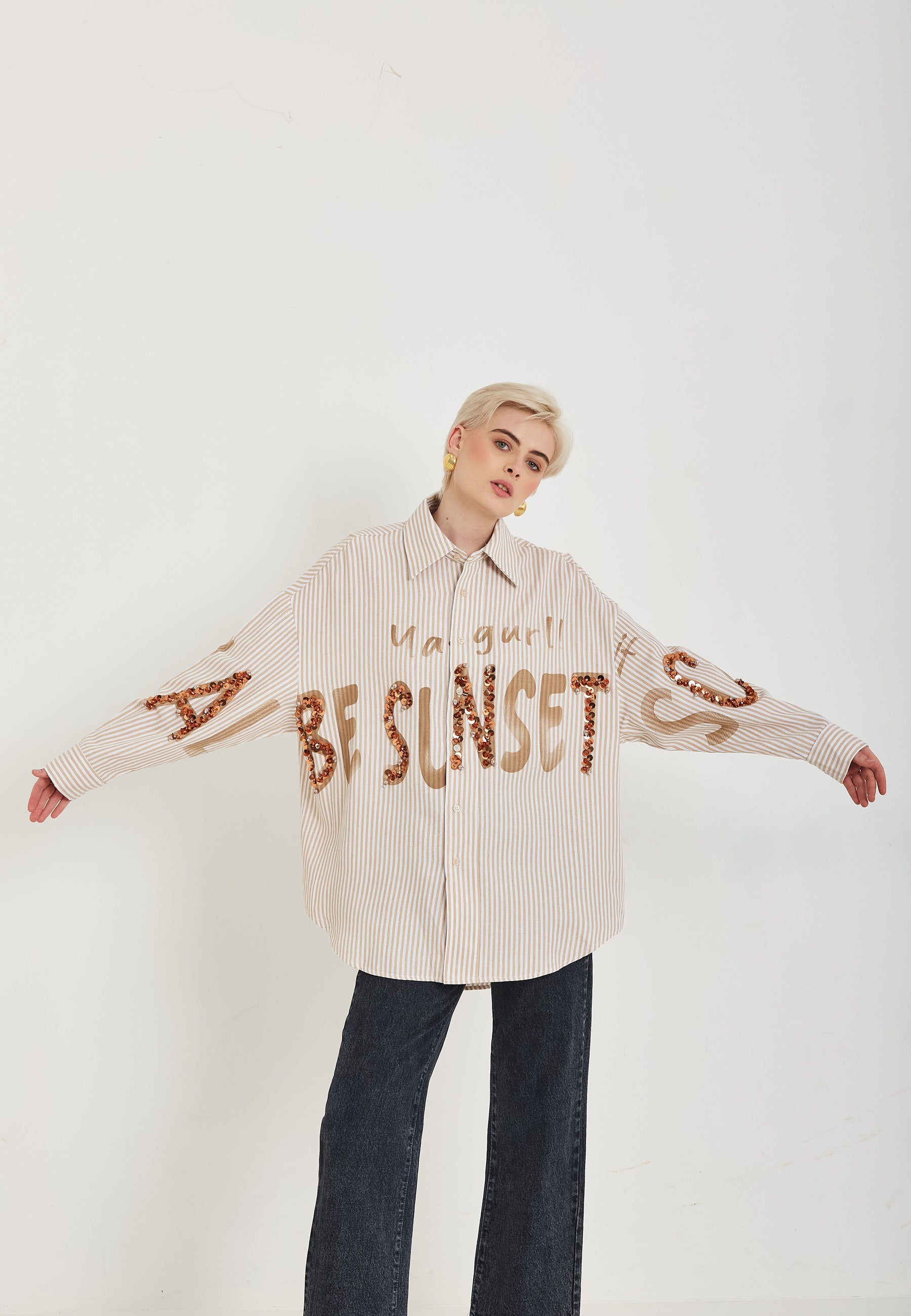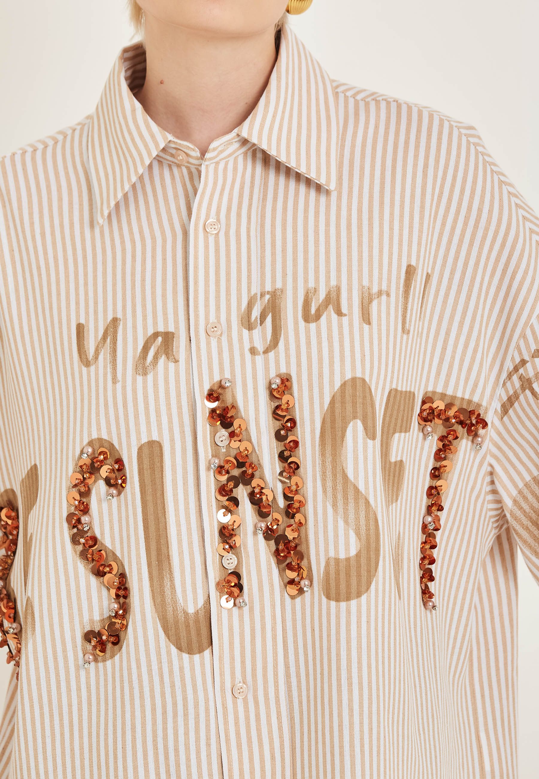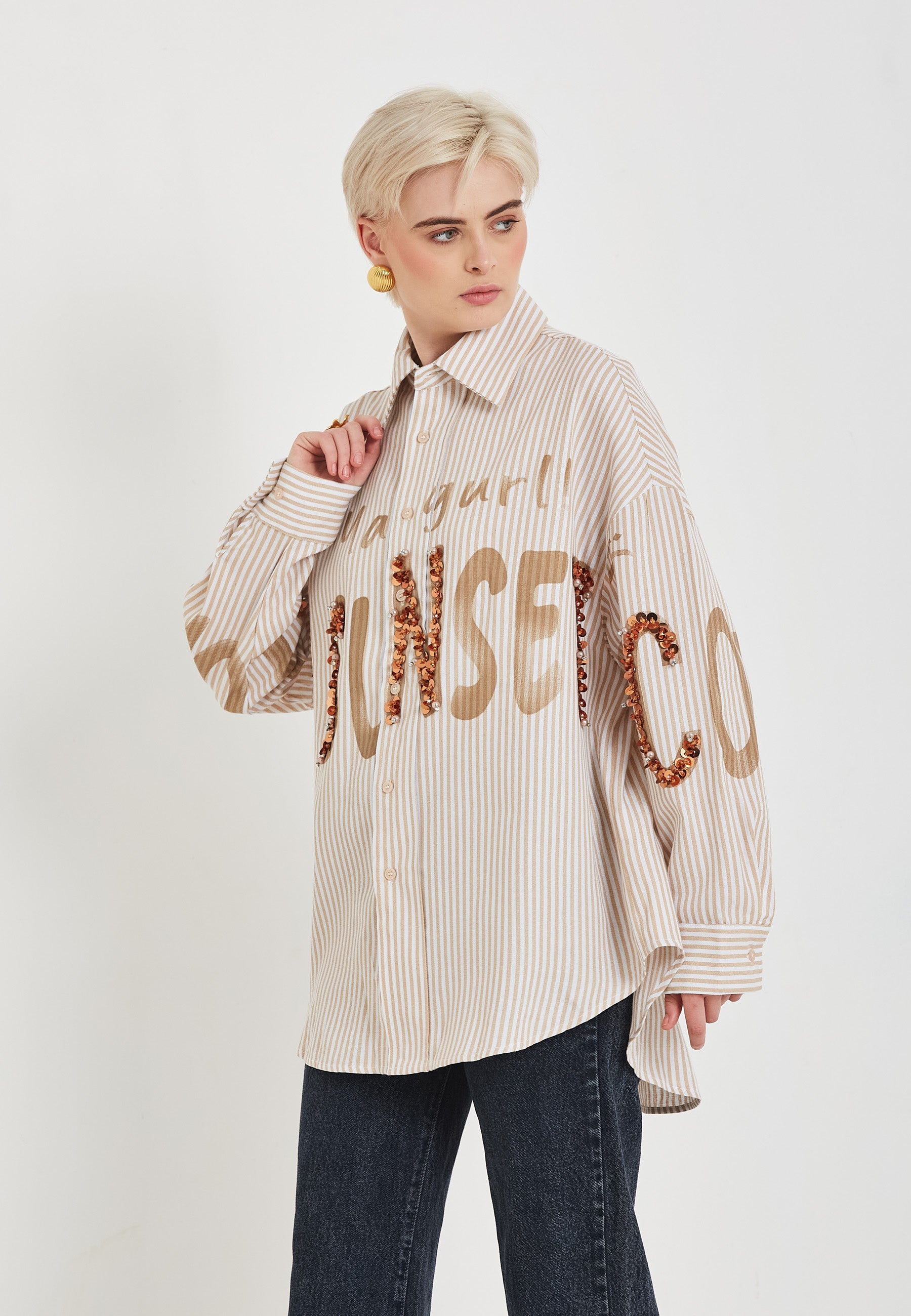 Arricchisci il tuo guardaroba con la camicia Miriam. Questa elegante camicia a righe è impreziosita da delicate paillettes fatte a mano che aggiungono un tocco glamour a qualsiasi outfit. Realizzata con materiali di alta qualità, questa camicia è allo stesso tempo alla moda e resistente. Porta il tuo stile a un livello superiore con la camicia Miriam.