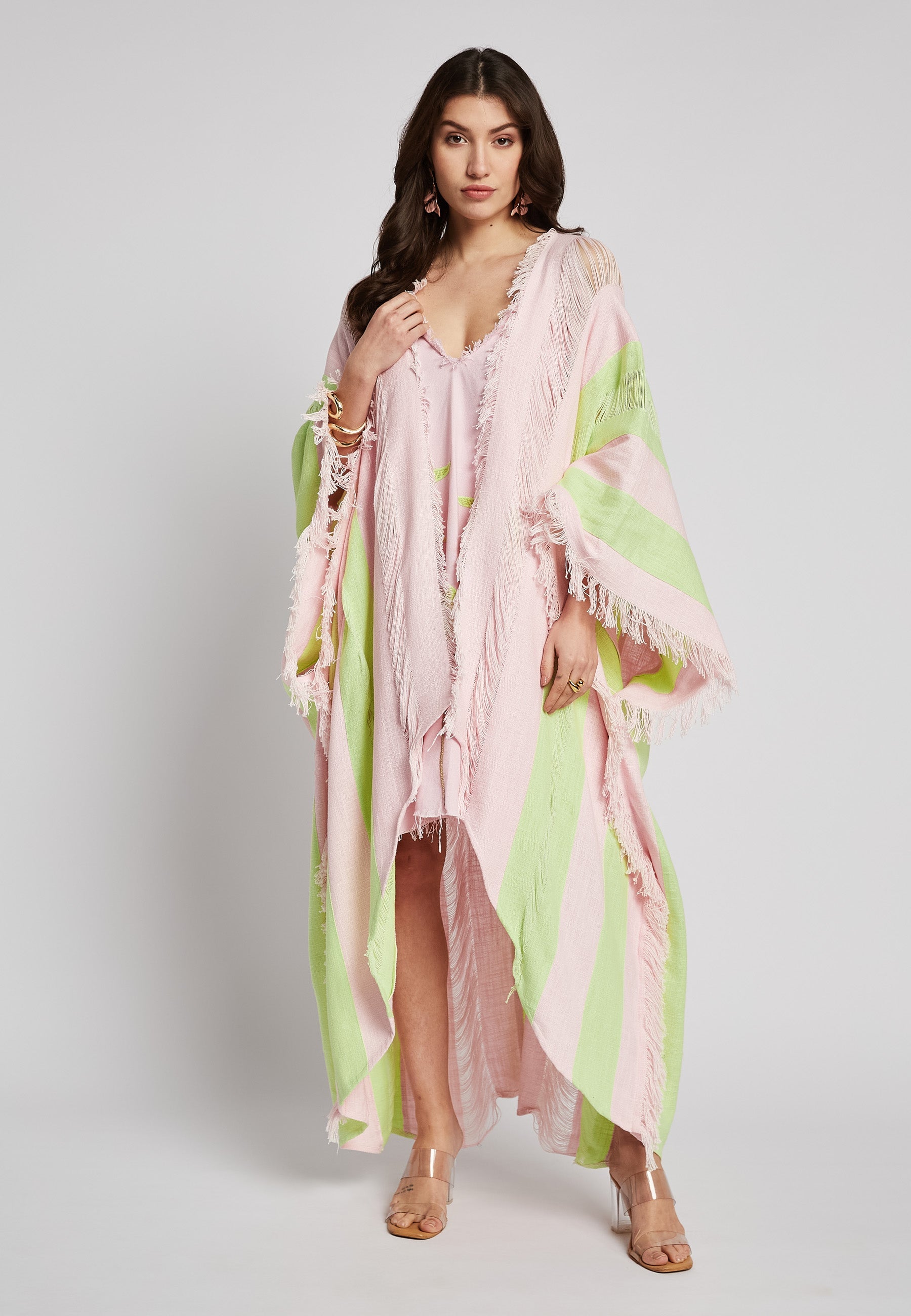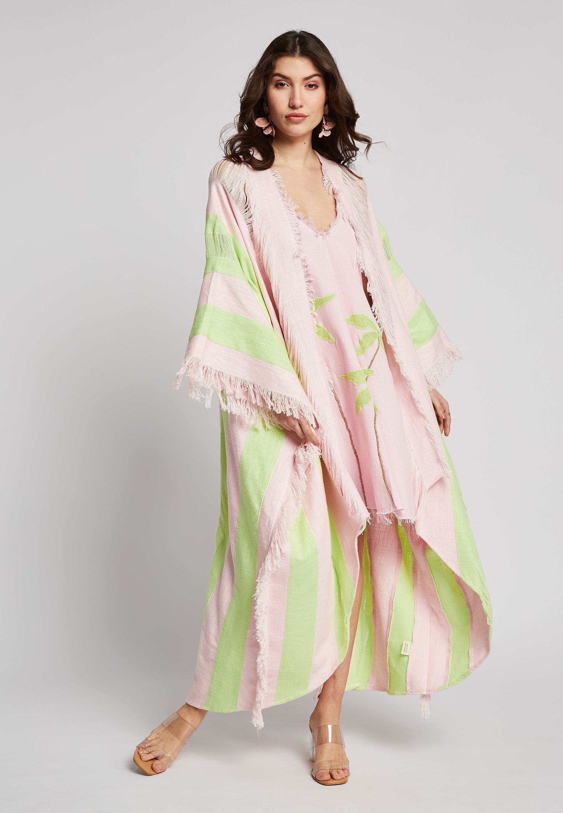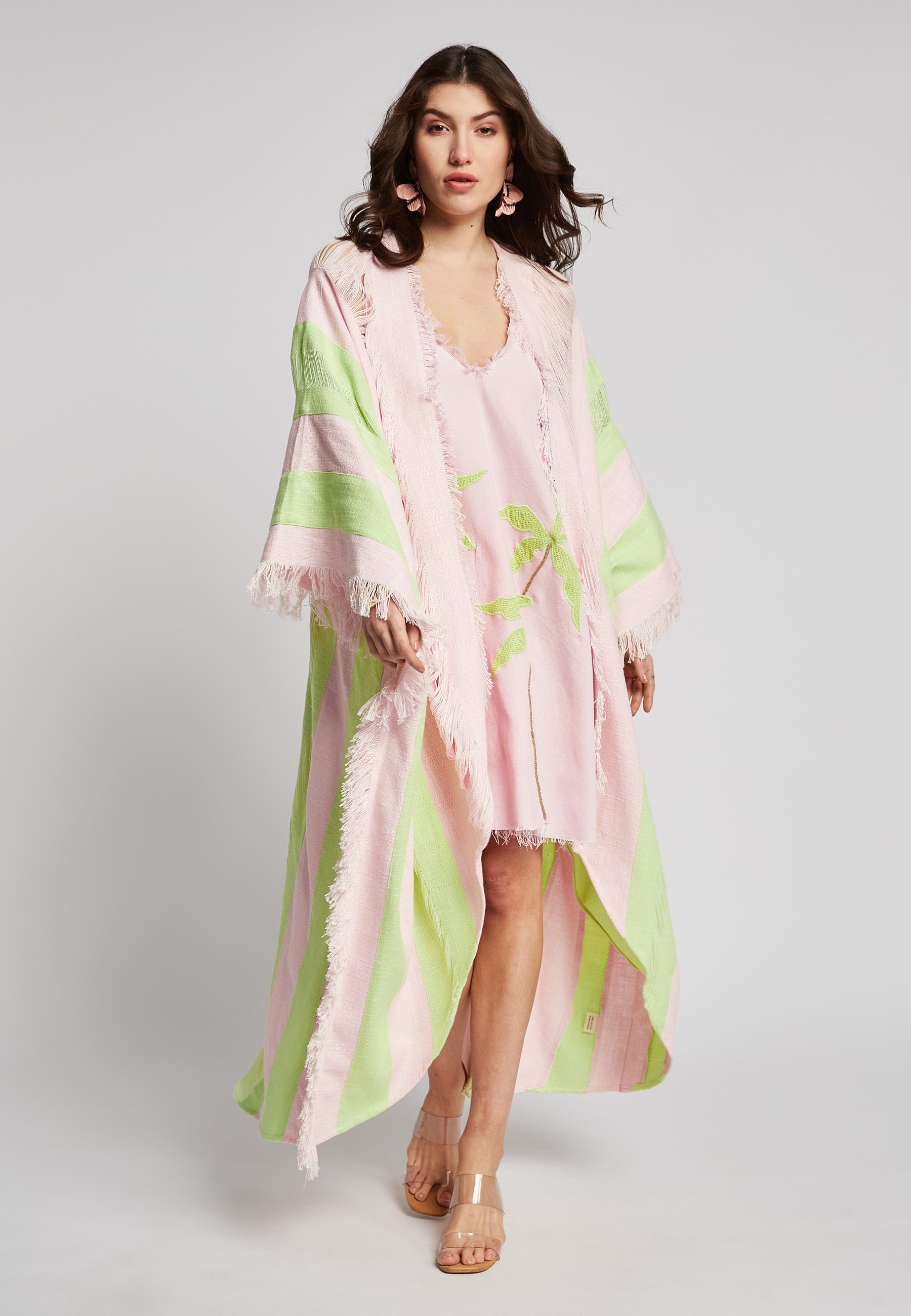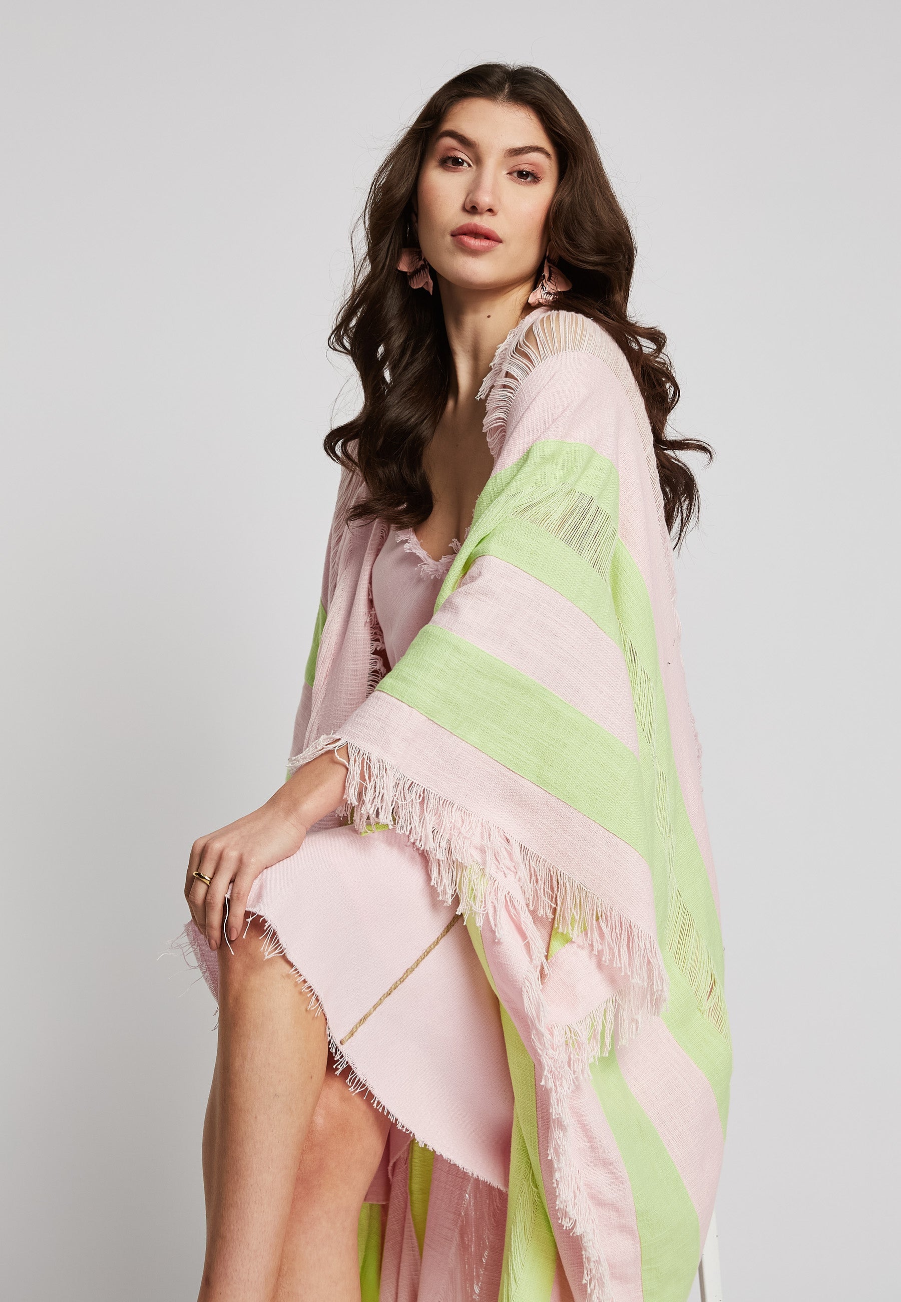 Esalta il tuo look da spiaggia con il nostro Kimono rosa salvia. Realizzato in cotone di qualità premium, questo kimono presenta una splendida combinazione di colori lime e rosa. Perfetto per aggiungere un tocco di stile al tuo guardaroba da spiaggia.