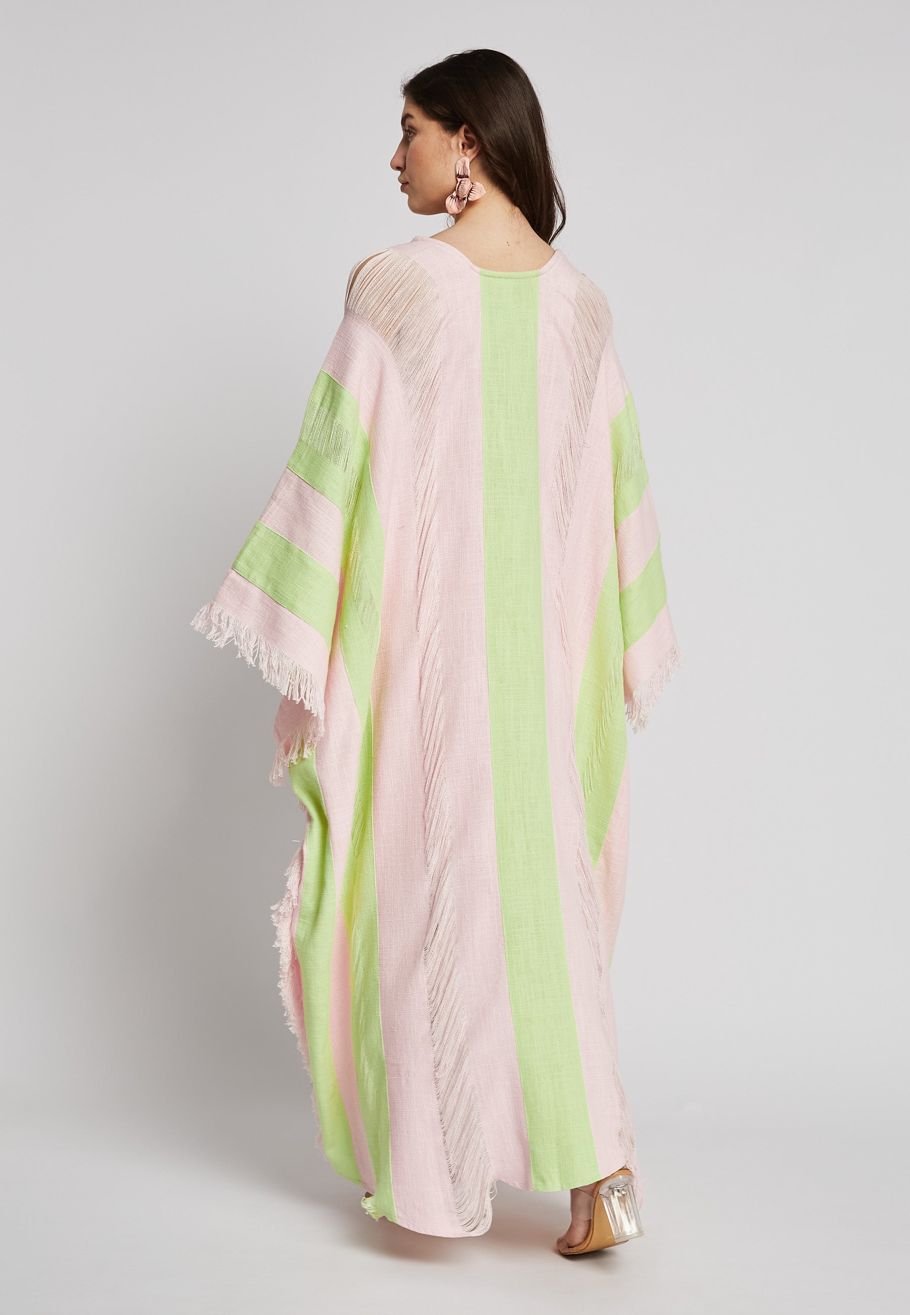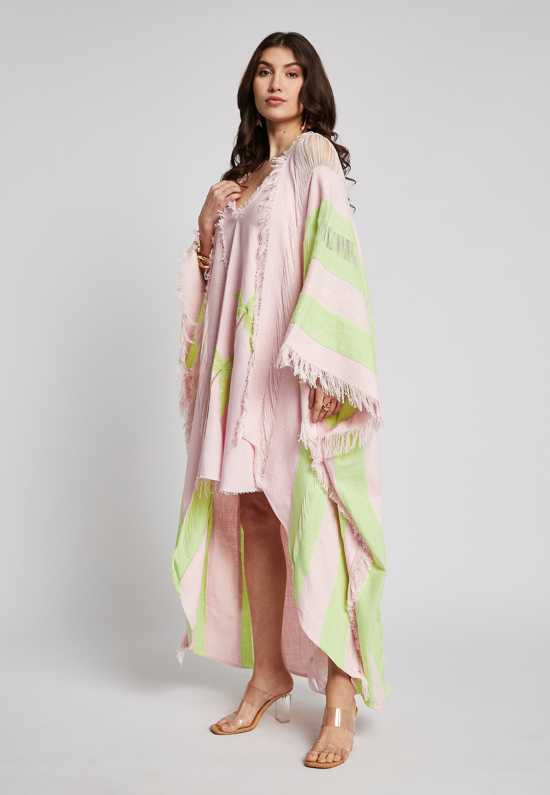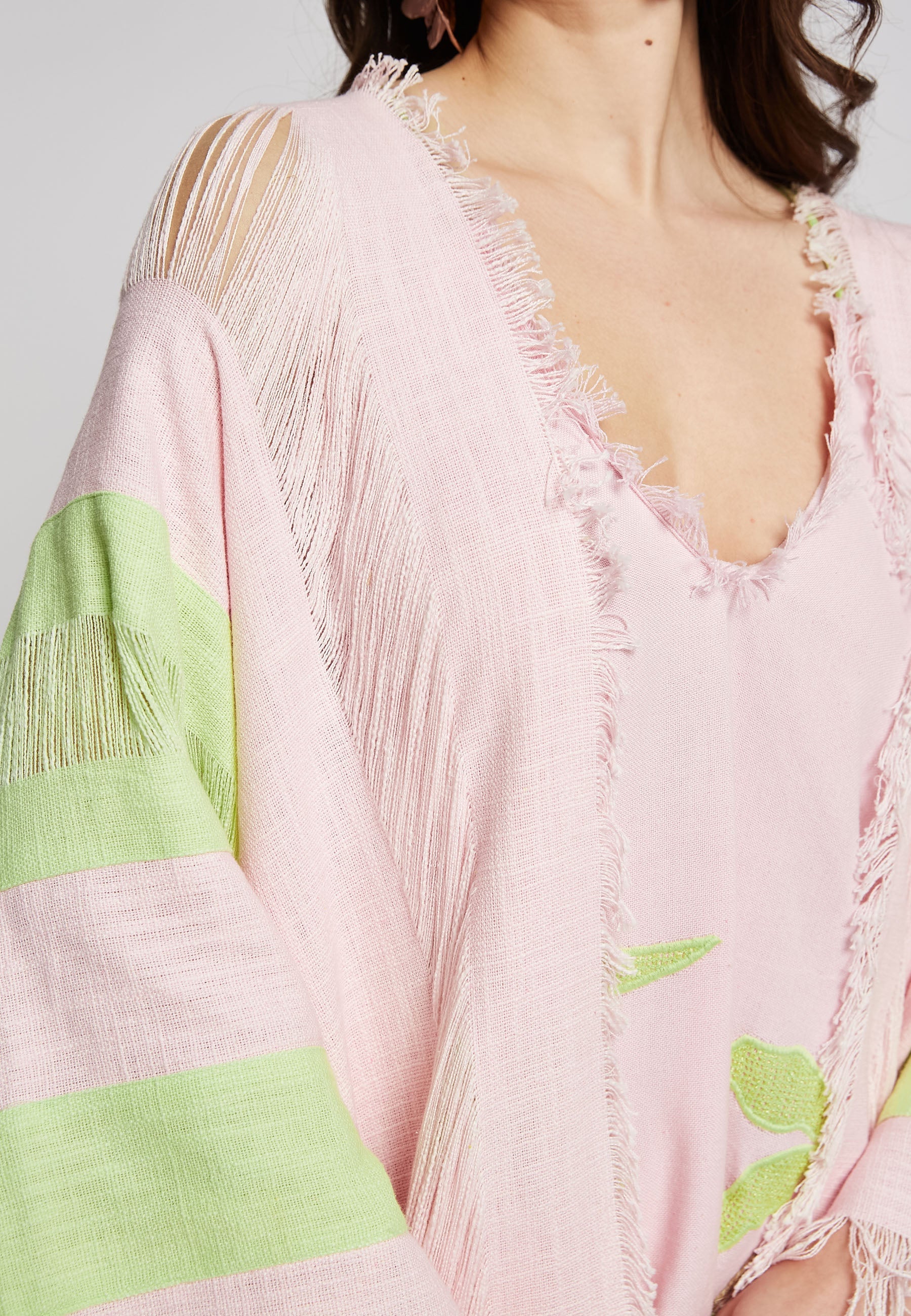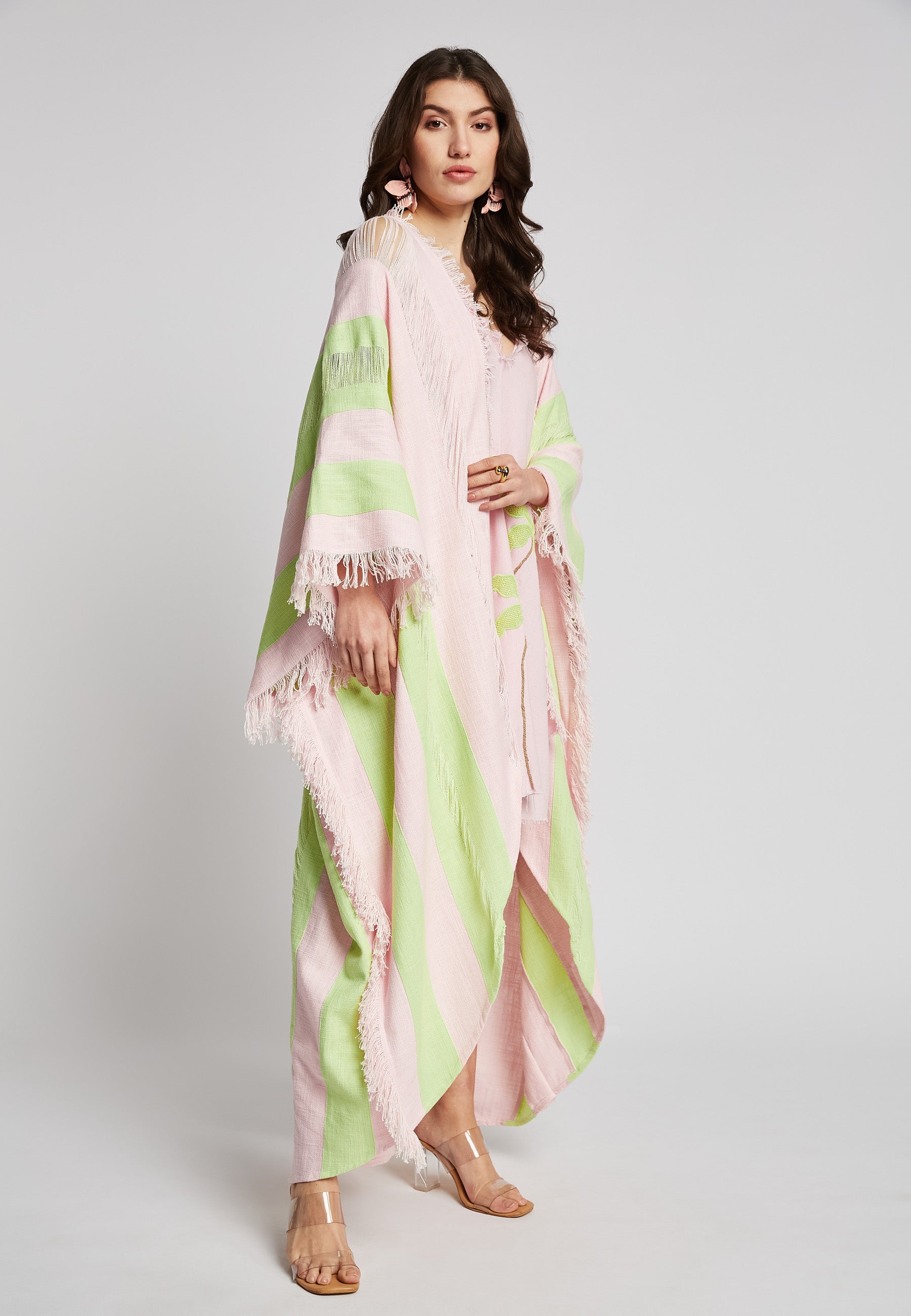 Esalta il tuo look da spiaggia con il nostro Kimono rosa salvia. Realizzato in cotone di qualità premium, questo kimono presenta una splendida combinazione di colori lime e rosa. Perfetto per aggiungere un tocco di stile al tuo guardaroba da spiaggia.