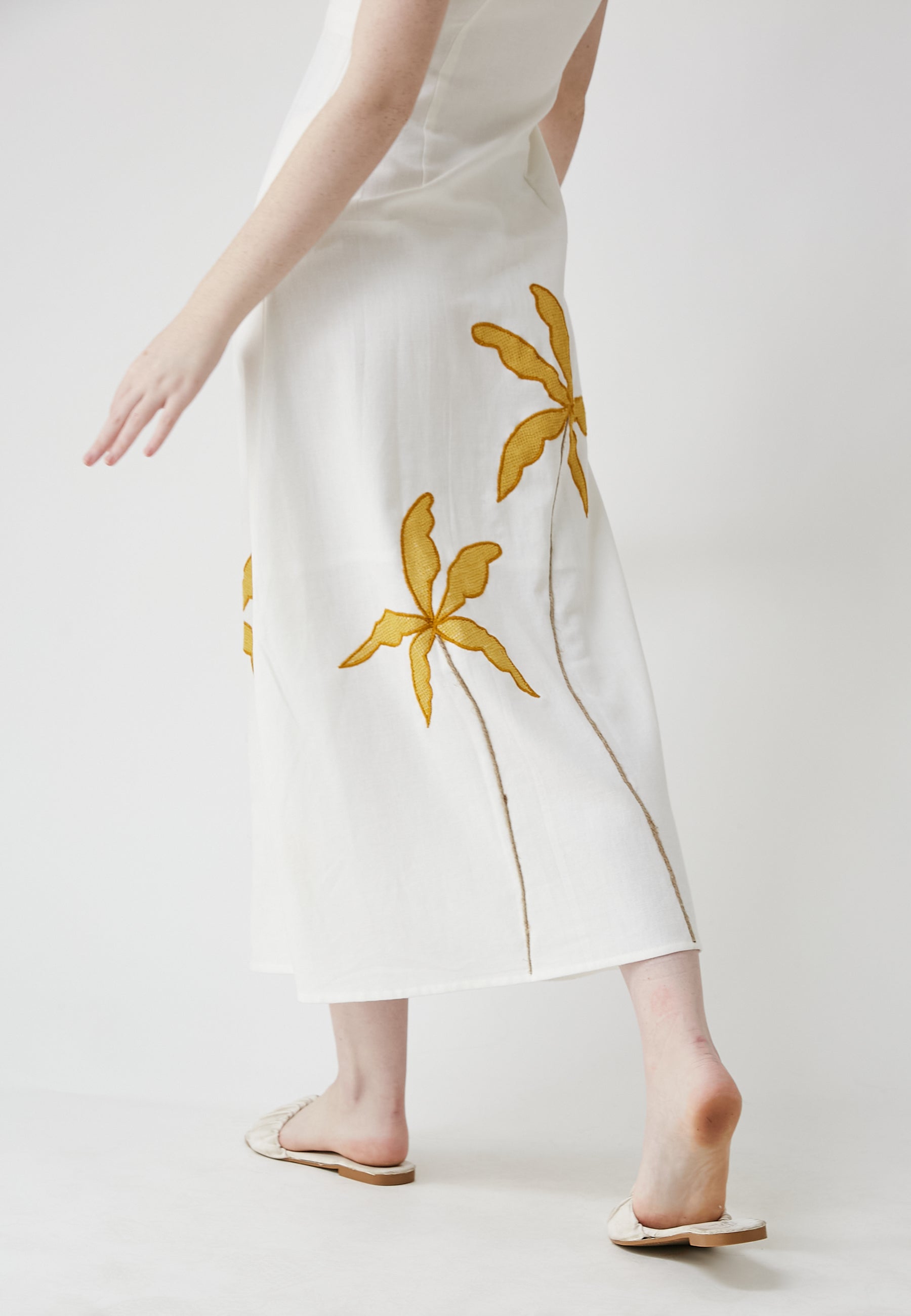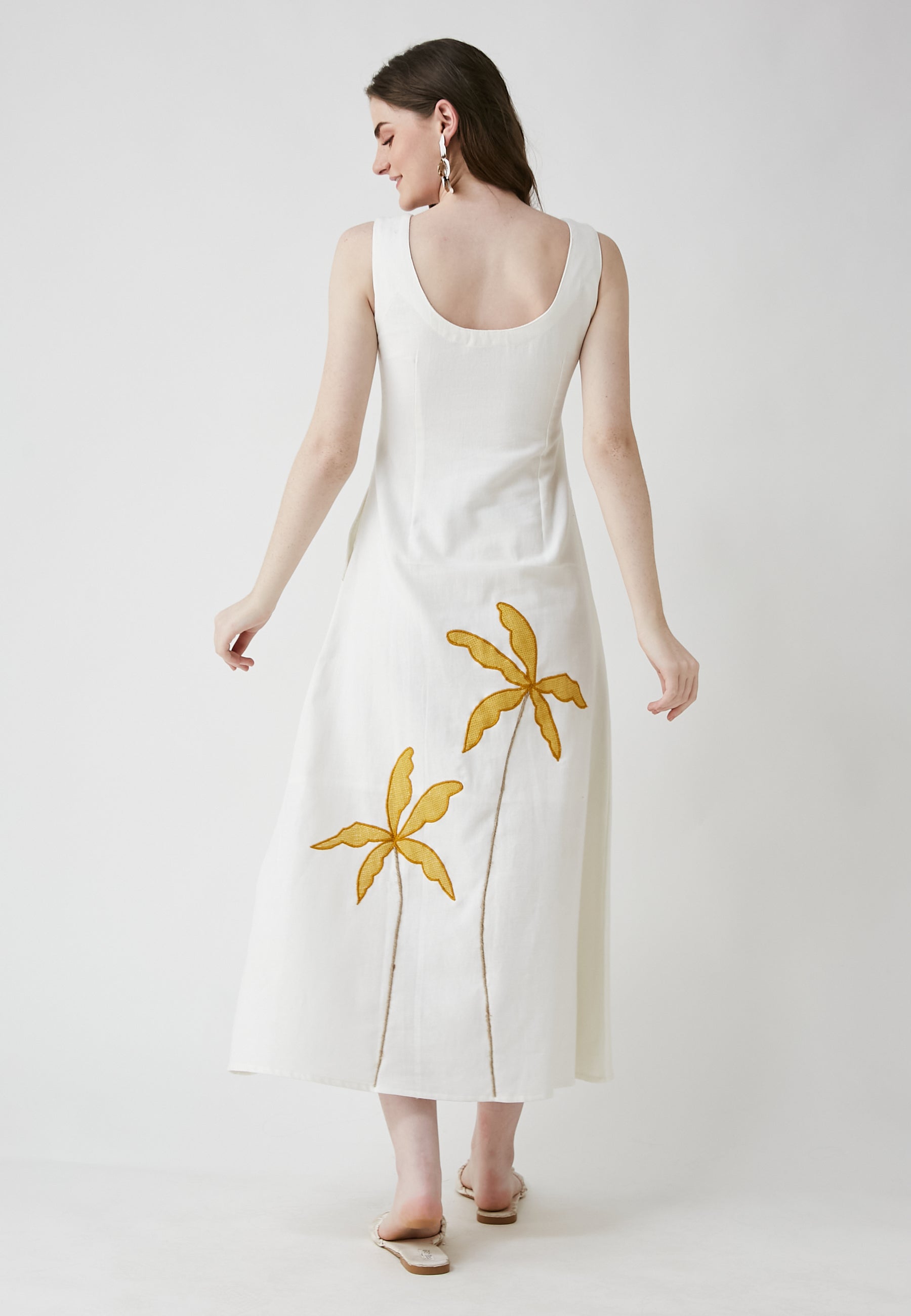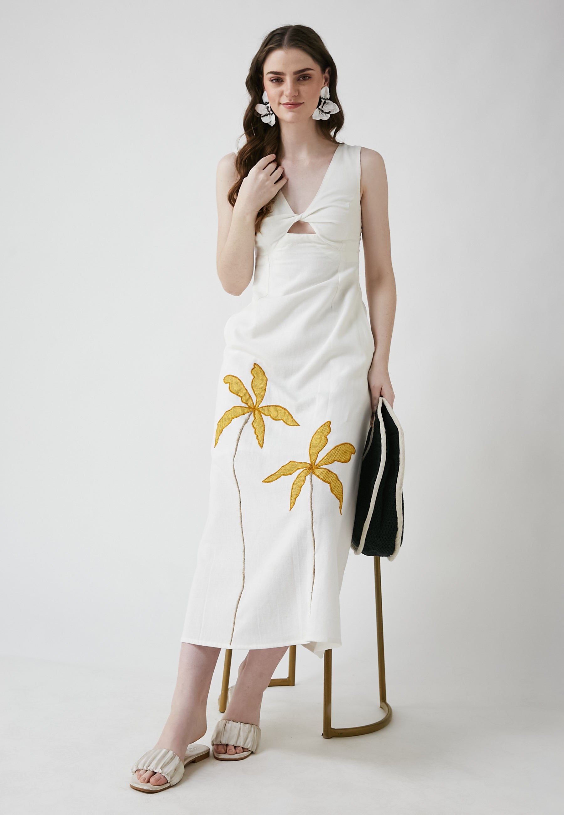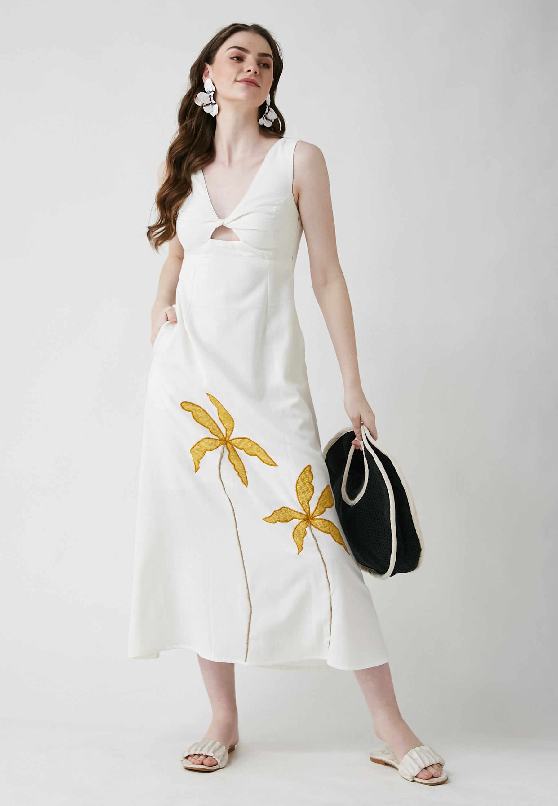 Indulge in luxury and sophistication with the Covin White Long Dress. This ankle-length cotton dress is perfect for summer, featuring exquisite palm tree embroidery. Elevate your wardrobe with this exclusive piece, exuding effortless elegance and timeless style.