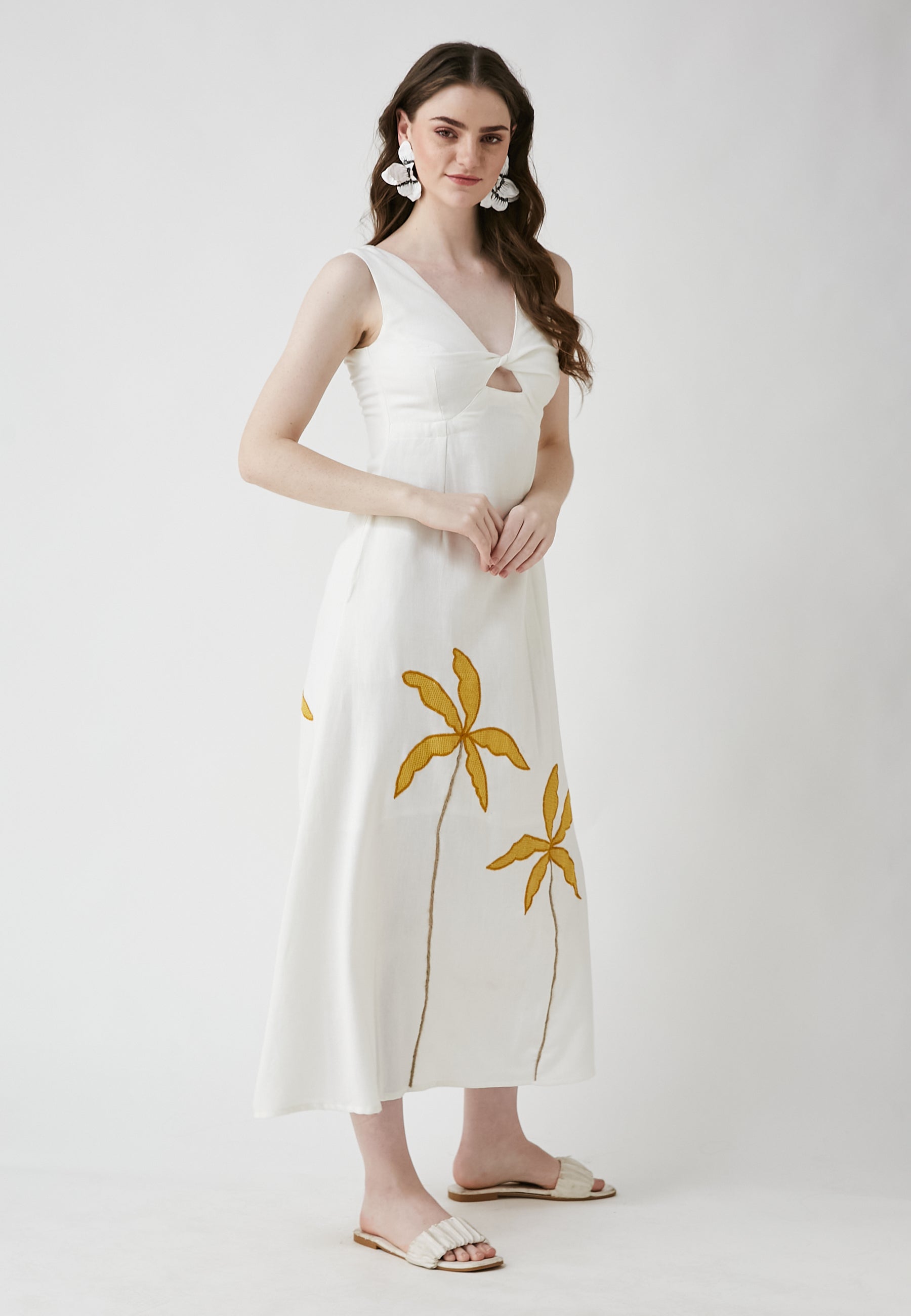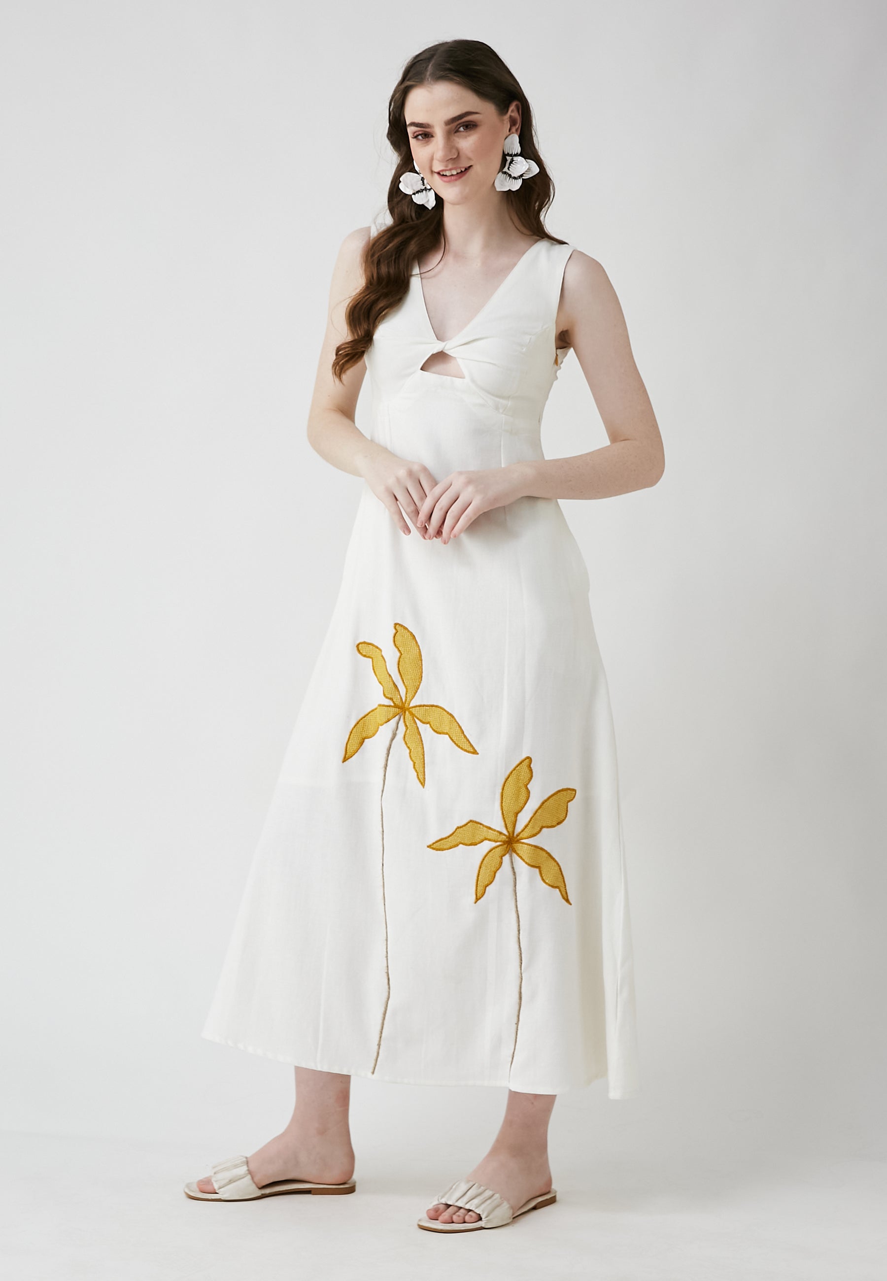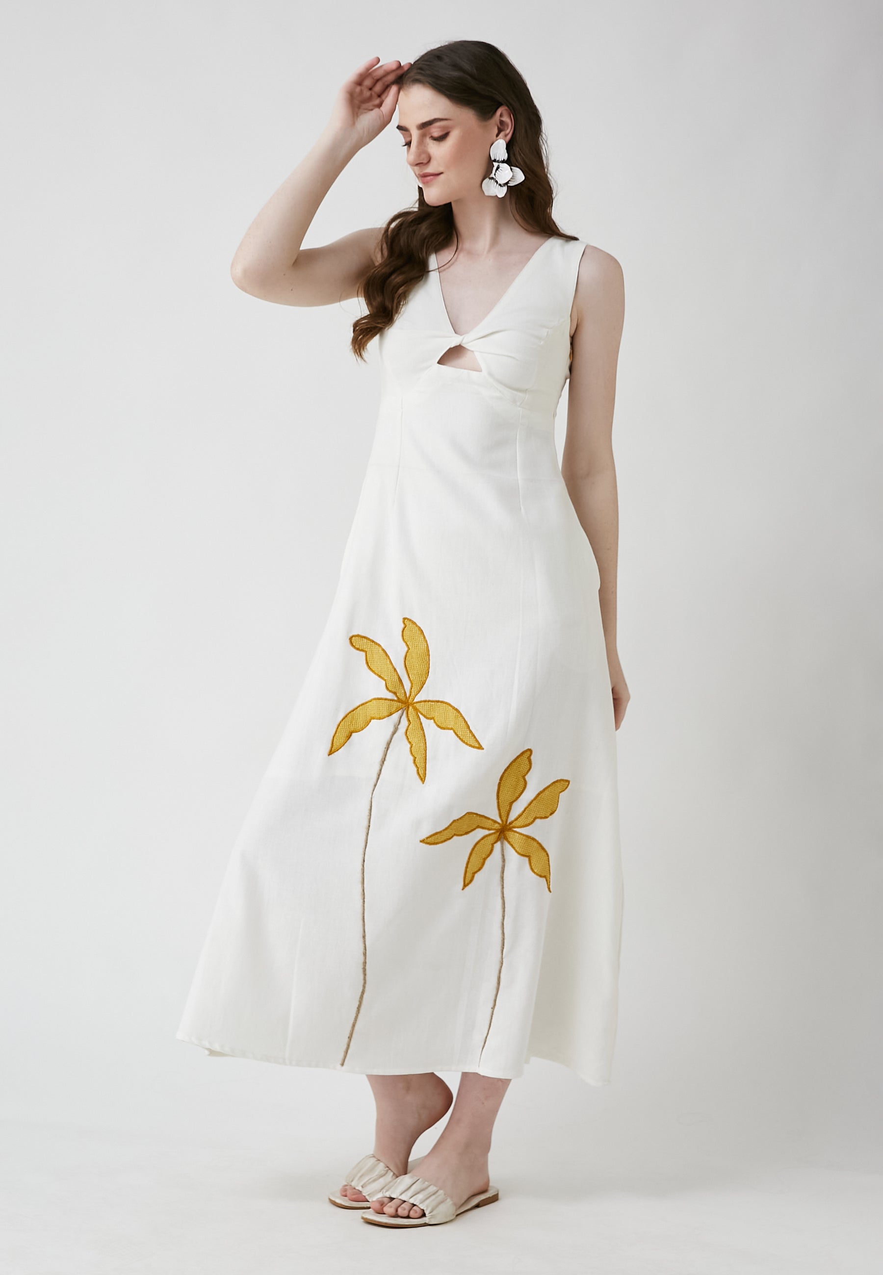 Indulge in luxury and sophistication with the Covin White Long Dress. This ankle-length cotton dress is perfect for summer, featuring exquisite palm tree embroidery. Elevate your wardrobe with this exclusive piece, exuding effortless elegance and timeless style.