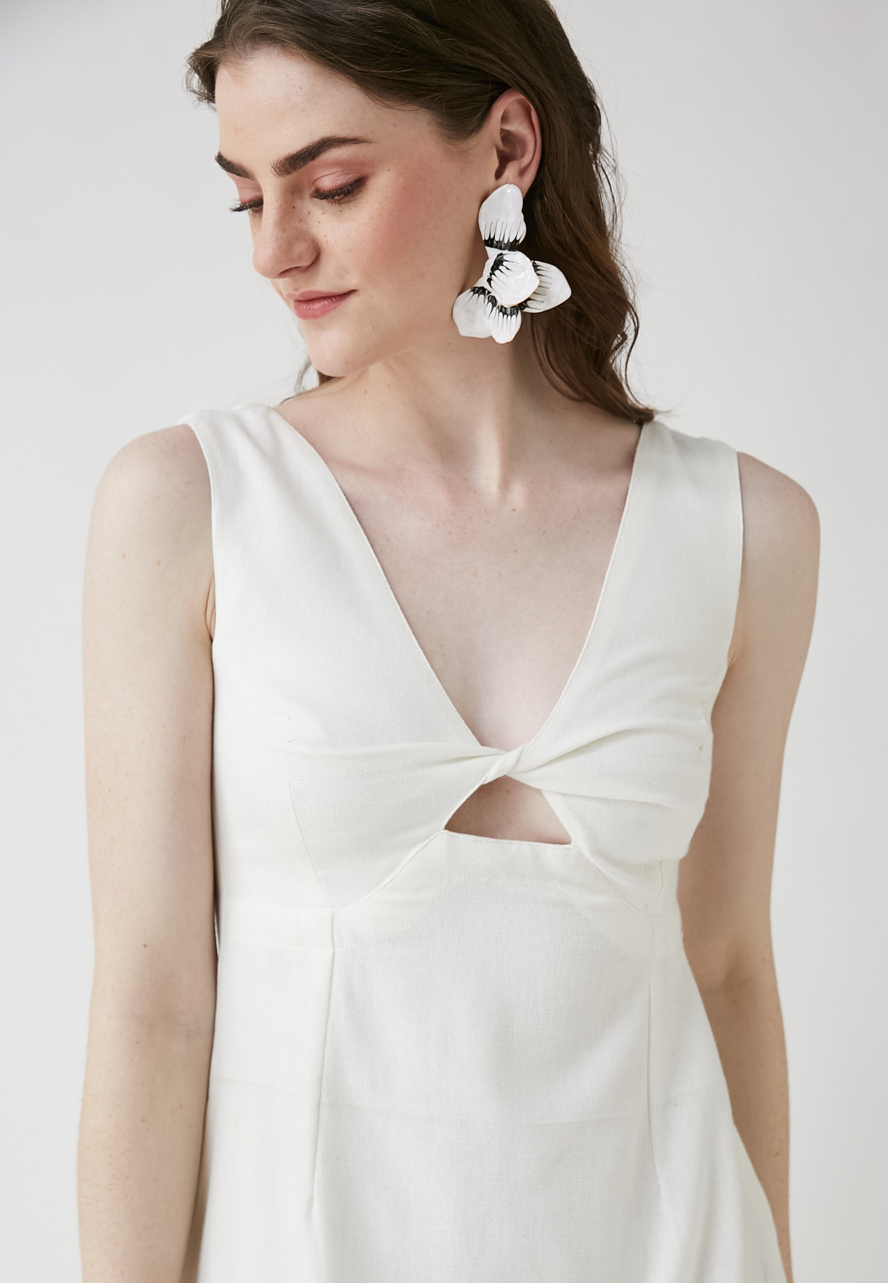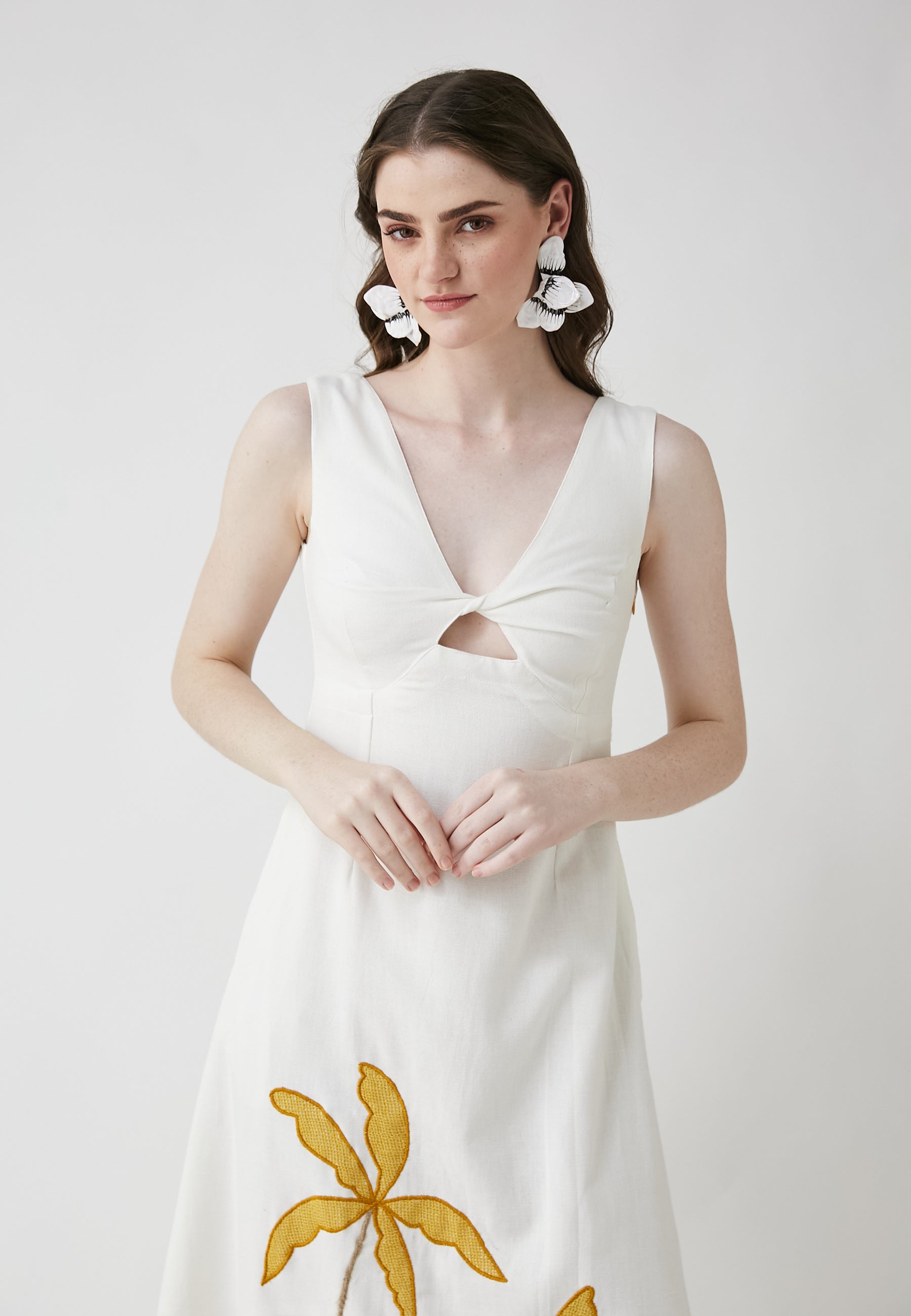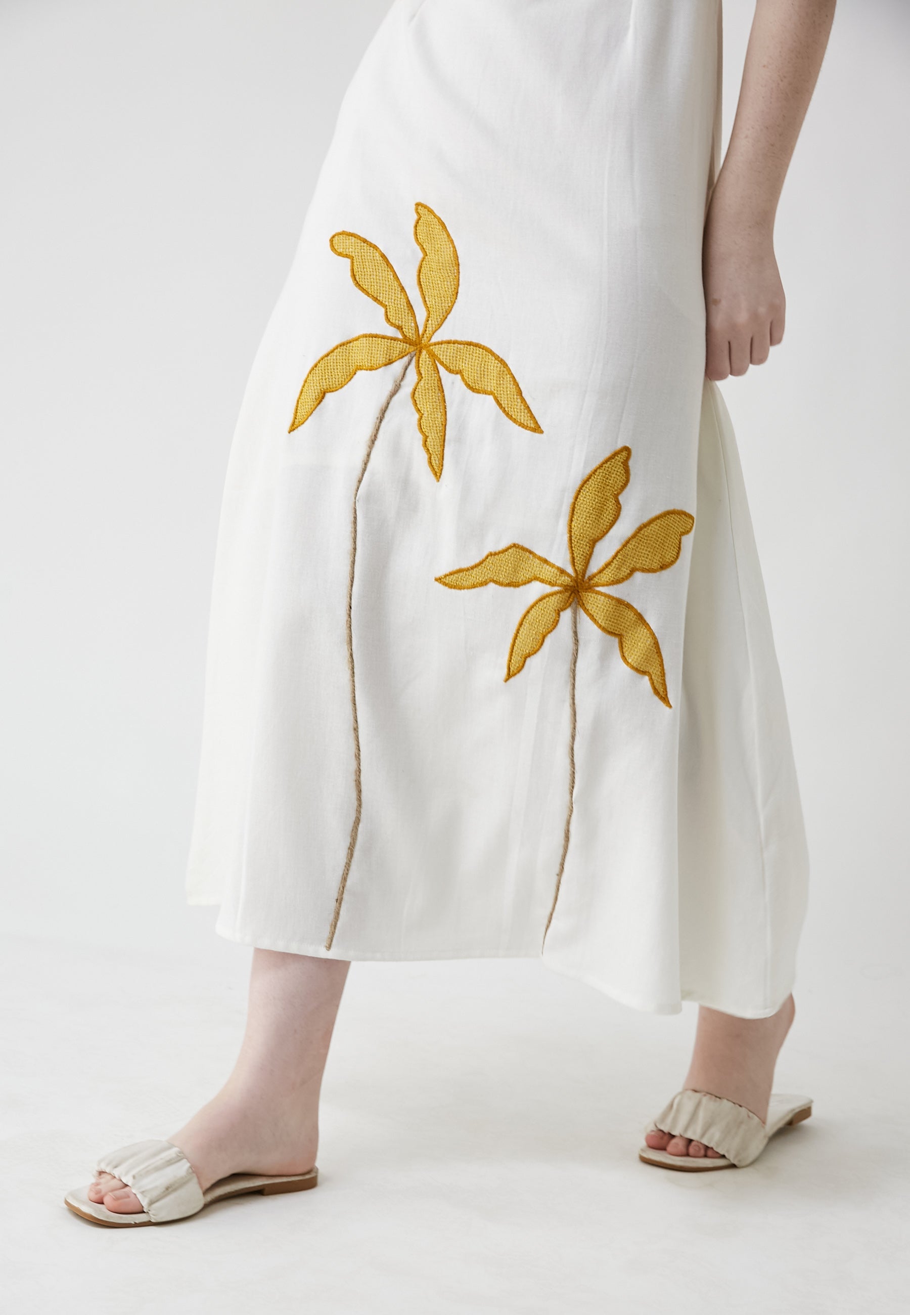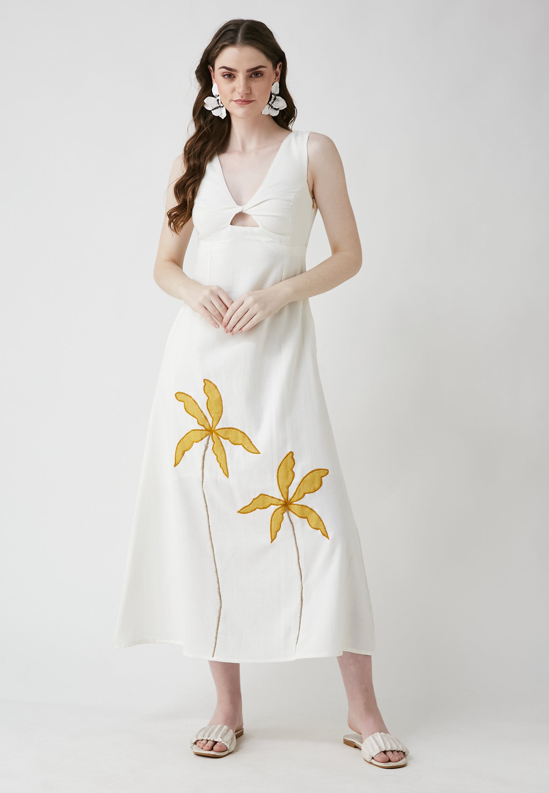Indulge in luxury and sophistication with the Covin White Long Dress. This ankle-length cotton dress is perfect for summer, featuring exquisite palm tree embroidery. Elevate your wardrobe with this exclusive piece, exuding effortless elegance and timeless style.