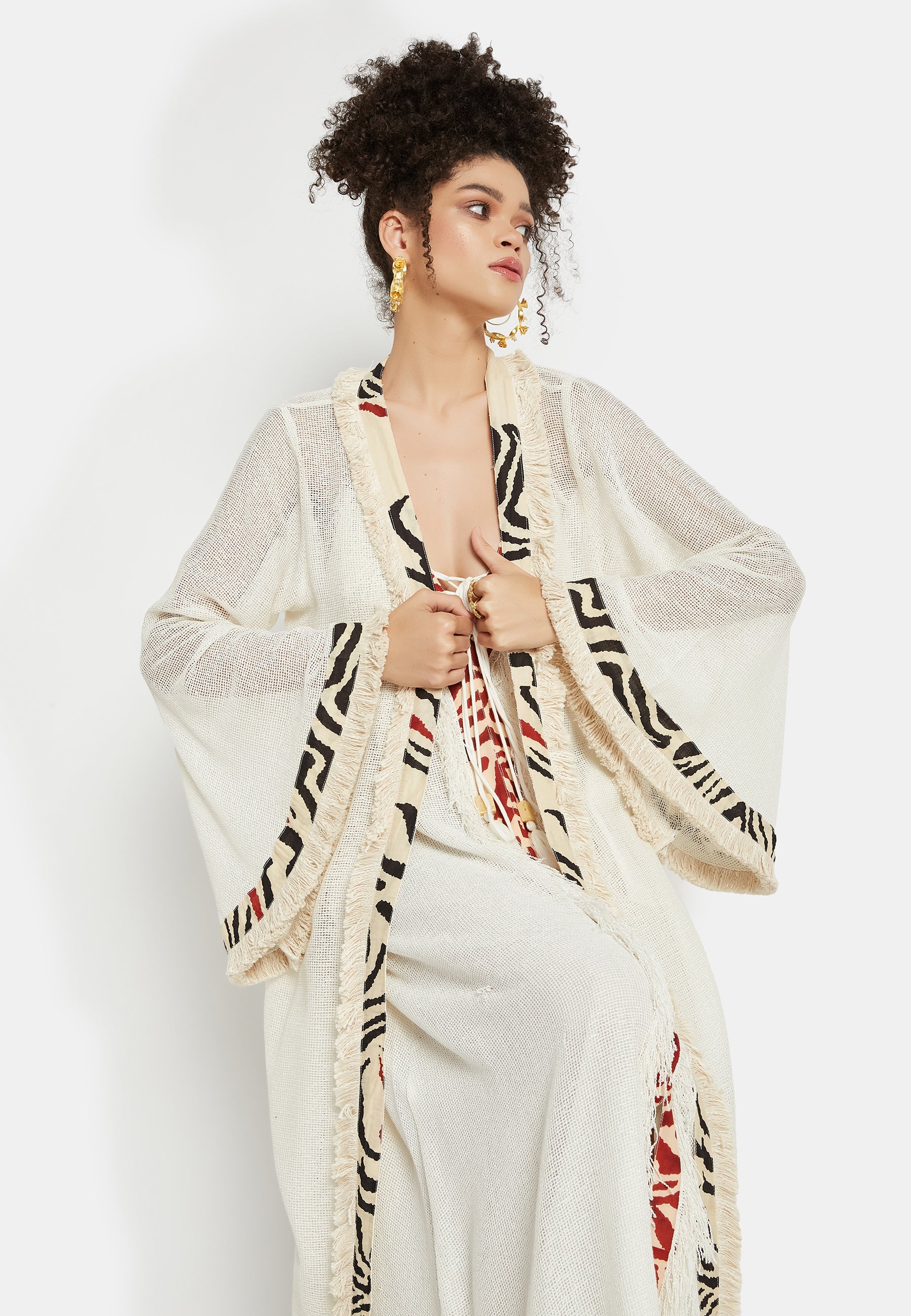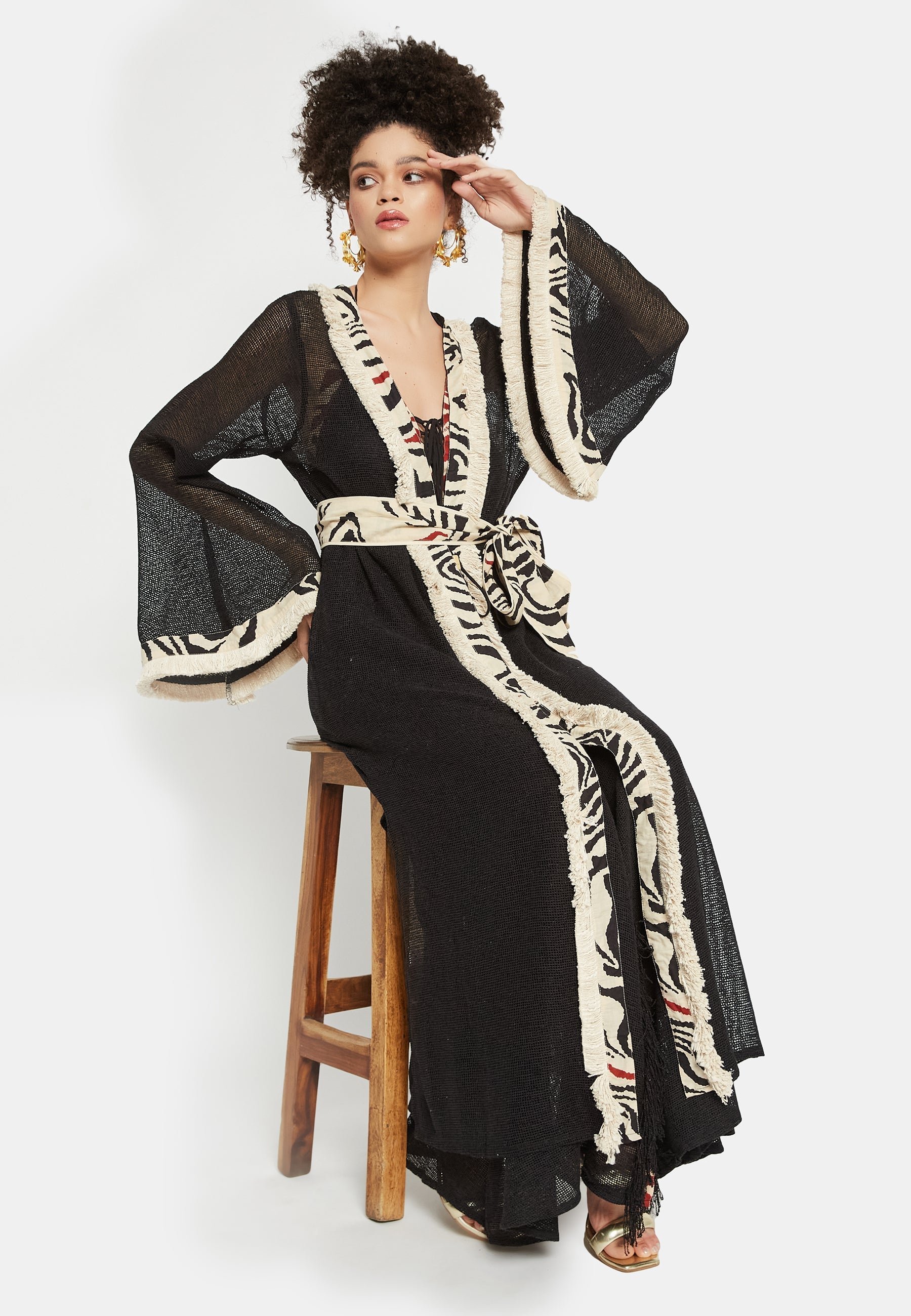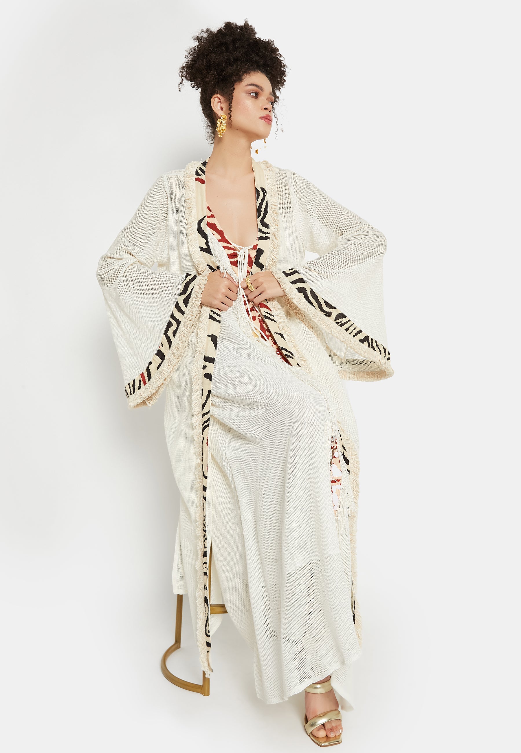 Introducing the "Kairos Kimono" from Be Sunset's exclusive Nidhi's Collection – a versatile masterpiece that redefines elegance for all occasions. This exquisite cover-up is a harmonious blend of tradition and trend, perfect for complementing beach outfits. Its flowing silhouette and delicate fabric provide a sense of ethereal grace, making it an ideal choice for both casual and formal gatherings.