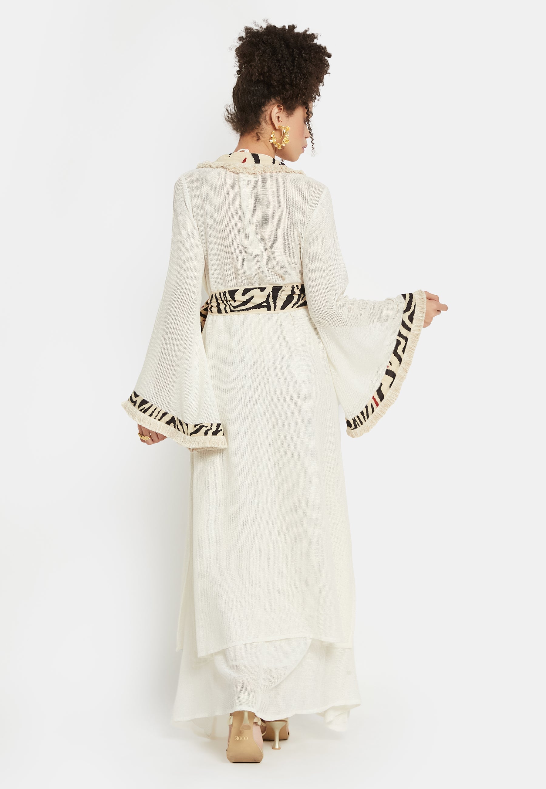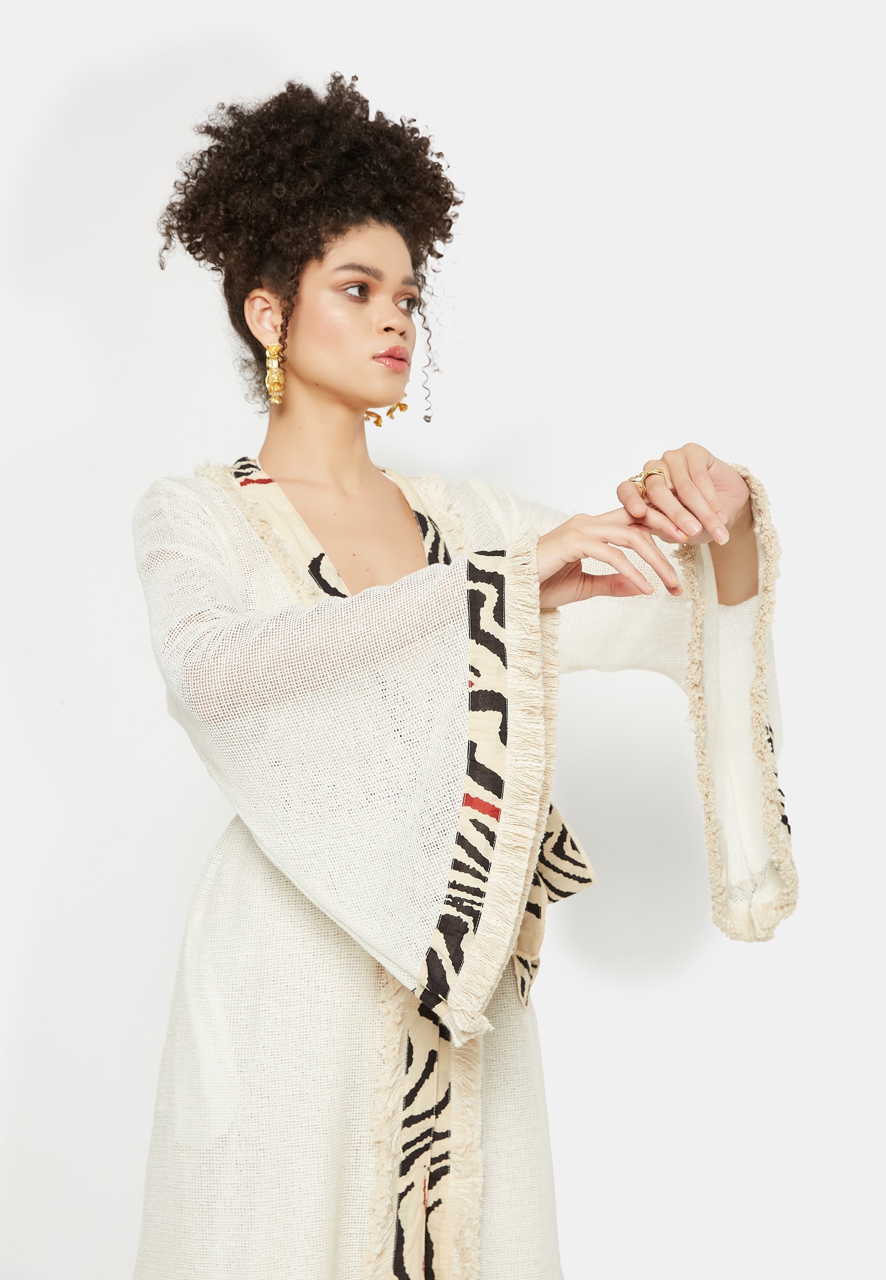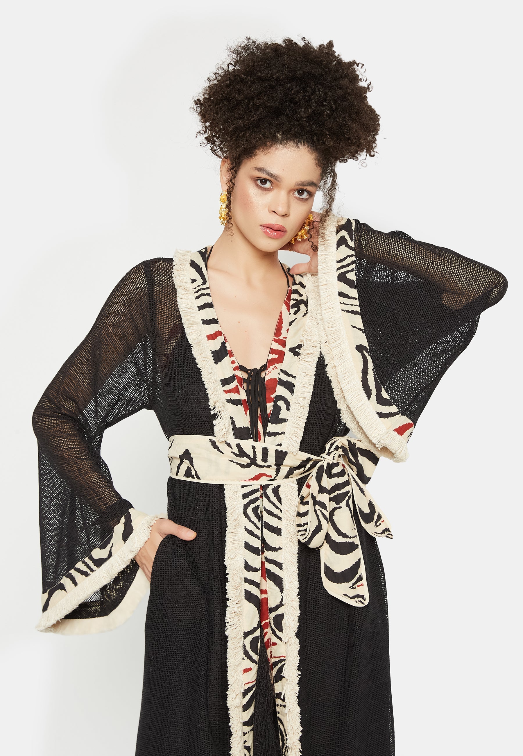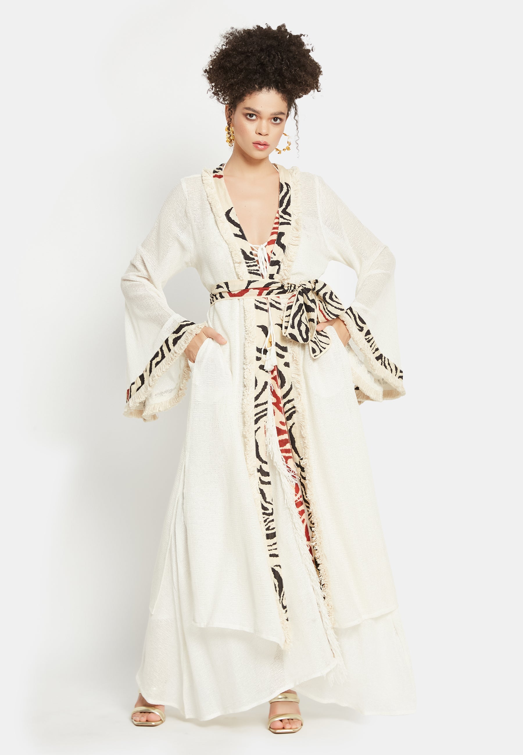 Introducing the "Kairos Kimono" from Be Sunset's exclusive Nidhi's Collection – a versatile masterpiece that redefines elegance for all occasions. This exquisite cover-up is a harmonious blend of tradition and trend, perfect for complementing beach outfits. Its flowing silhouette and delicate fabric provide a sense of ethereal grace, making it an ideal choice for both casual and formal gatherings.