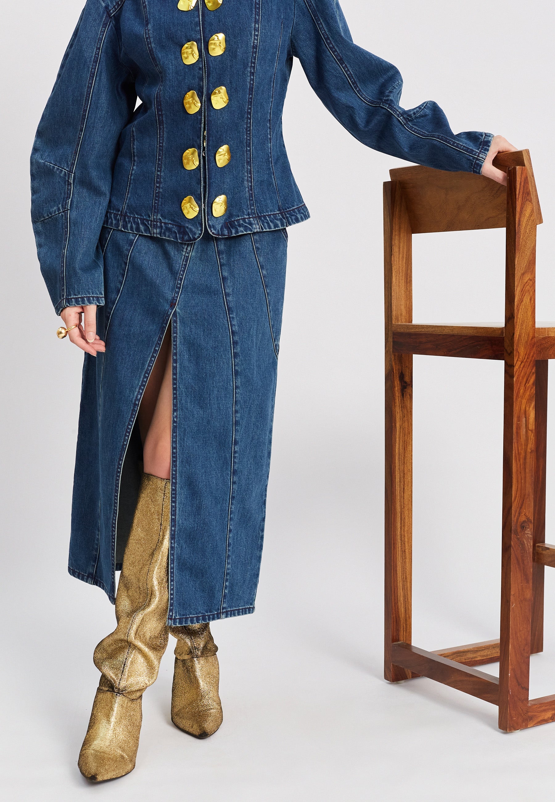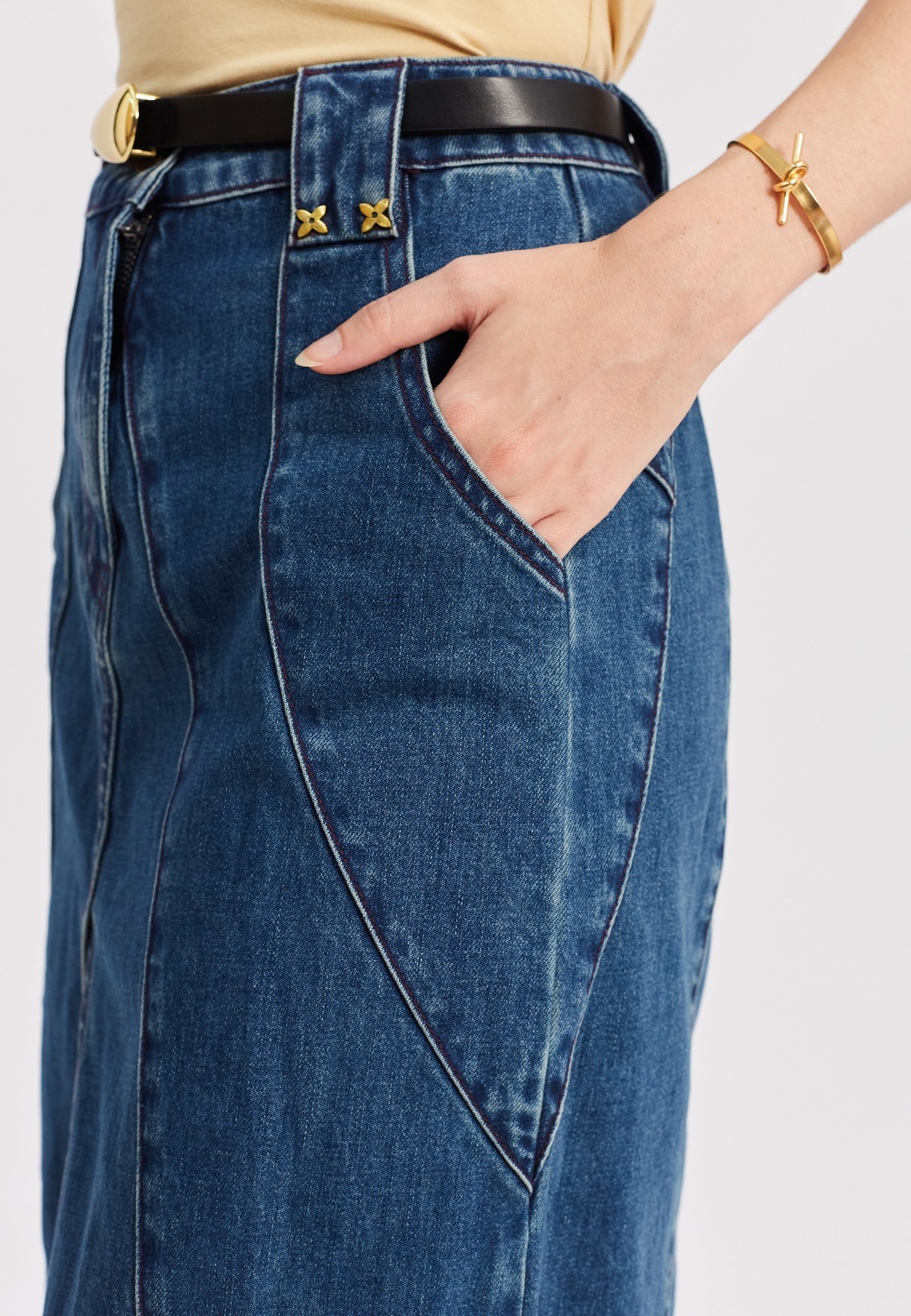 The denim skirt in a natural wash offers a versatile and stylish addition to your wardrobe. Plus, it includes a belt made of vegan leather for added convenience. Embrace the casual yet trendy look with this essential piece.