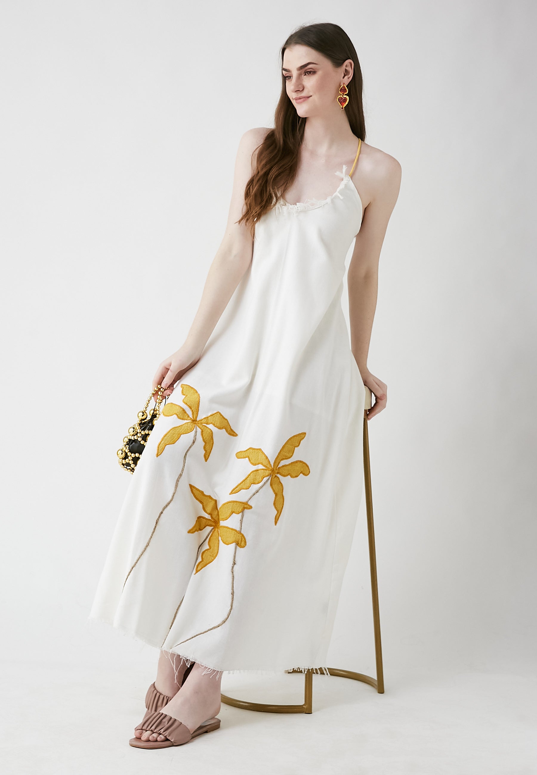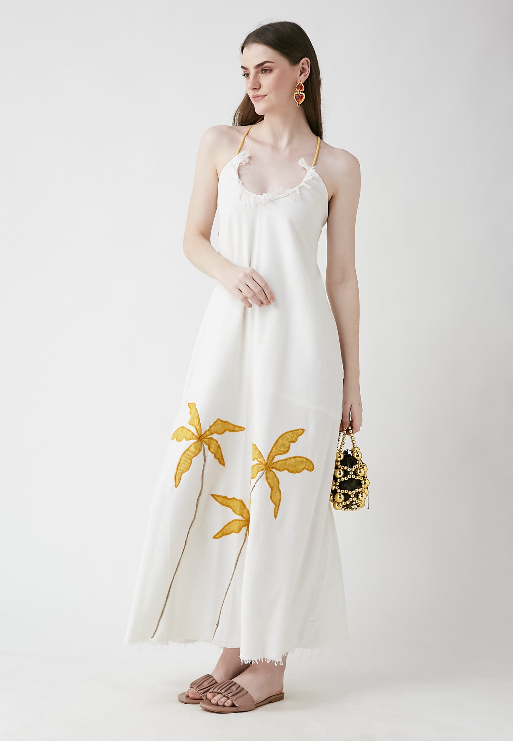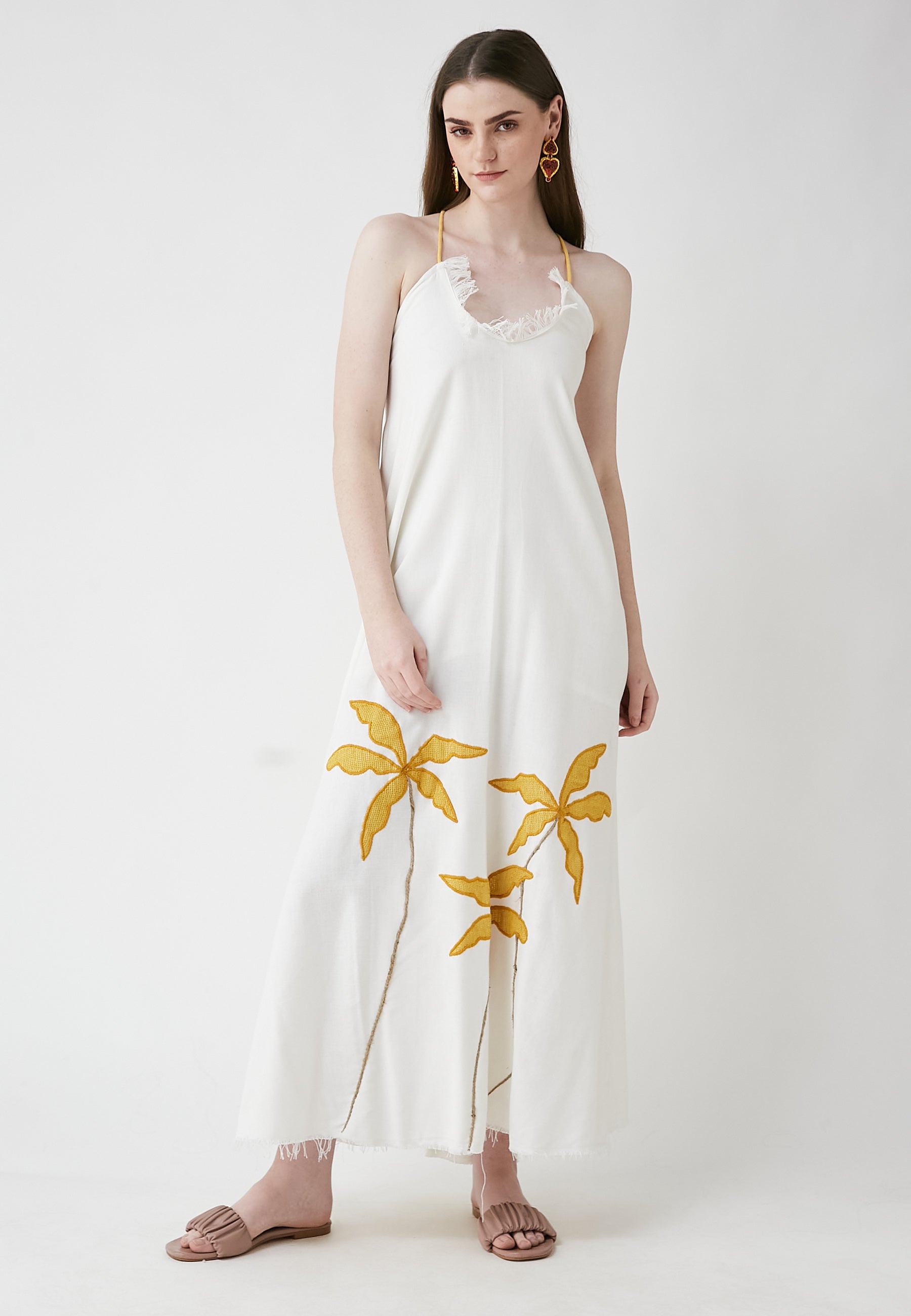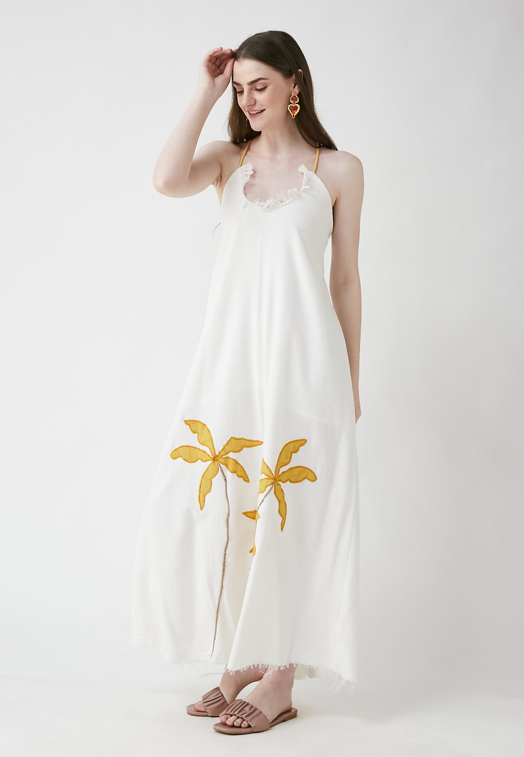 This exquisite long dress, crafted from luxurious cotton, exudes casual elegance. Intricate embroidery adds a touch of artistry, while the adjustable size ensures a perfect fit. Make a statement of sophistication and refinement with this tropical-inspired piece.