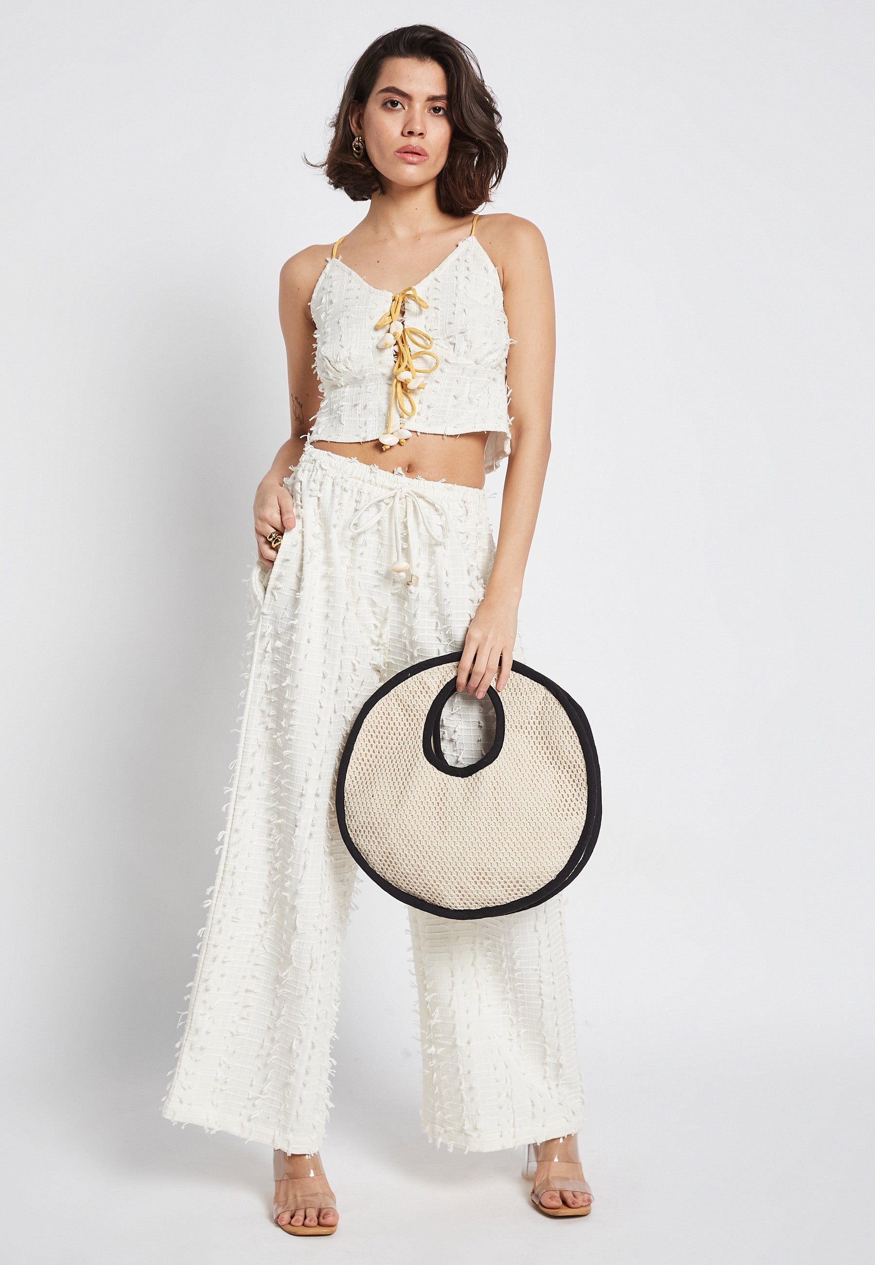 The Vivid Pel Top is a must-have for your summer wardrobe. Crafted from a textured white cotton fabric, this crop top showcases a trendy and chic design. Stay cool and stylish all season long with this versatile and comfortable piece.